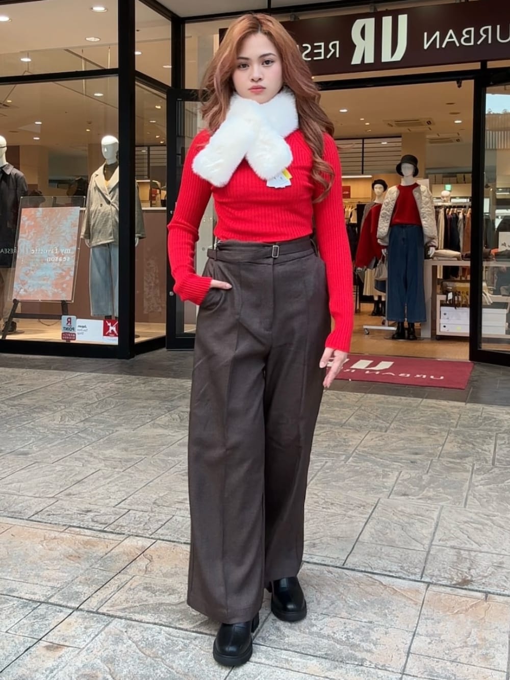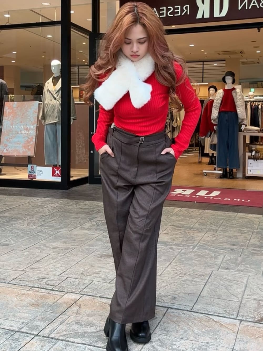 華やかな赤ニットが顔まわりを明るく見せ、ツイード素材のパンツがシーズンムードを引き立てます。