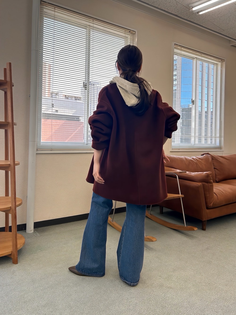 ゆったり着れるので、パーカーやニットの上から羽織れます。ミドル丈なのでFREEサイズですが、低身長の私でも着こなせるデザインです。