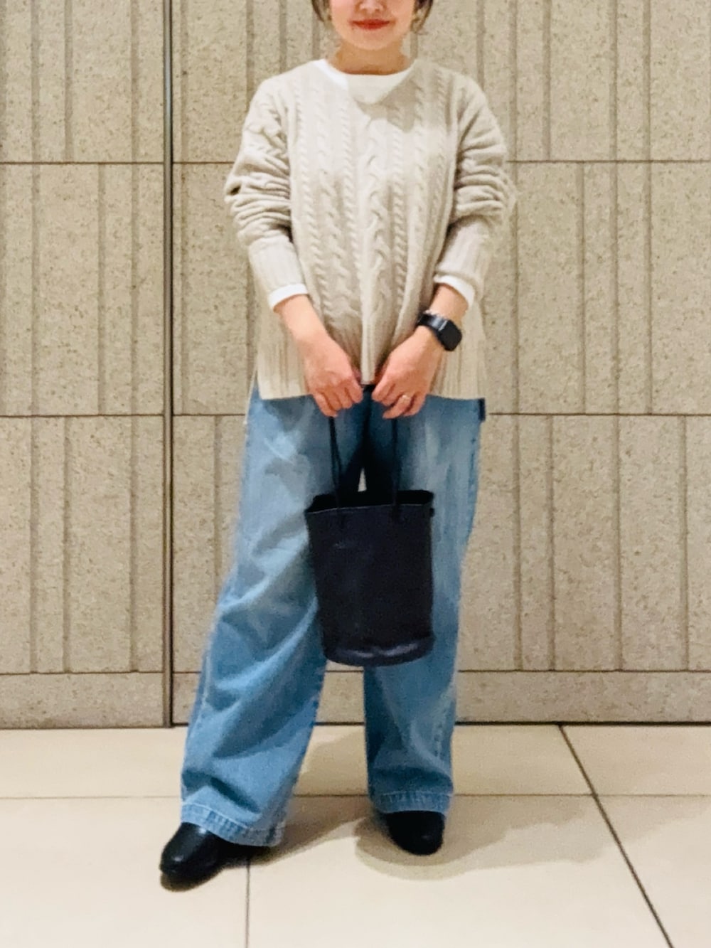 かぐれのフェードデニムを合わせてシンプルコーデにしました。レザー小物を合わせてメリハリを。