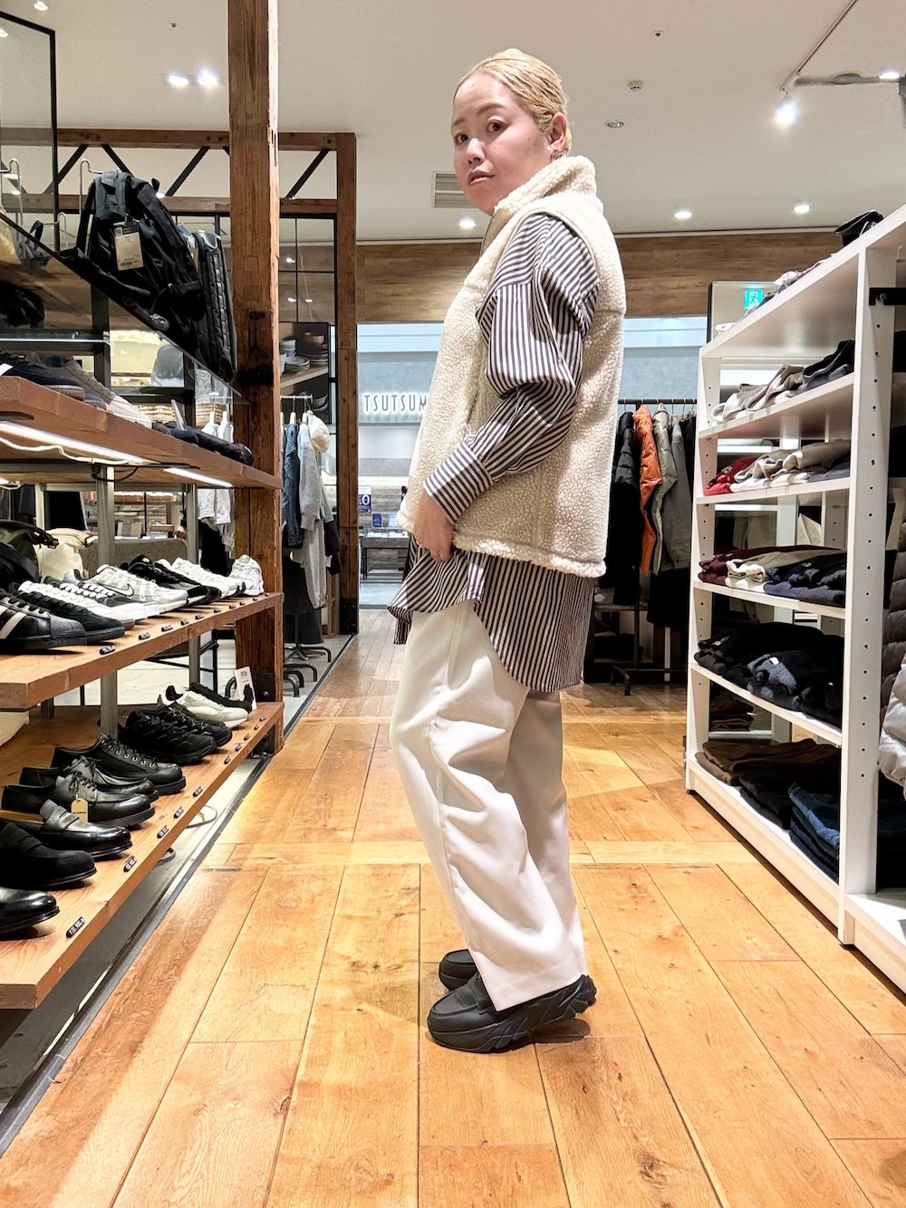 ジップパーカーはダブルジップなので下を開けても着用できます。パンツの柄は程よい存在感です。