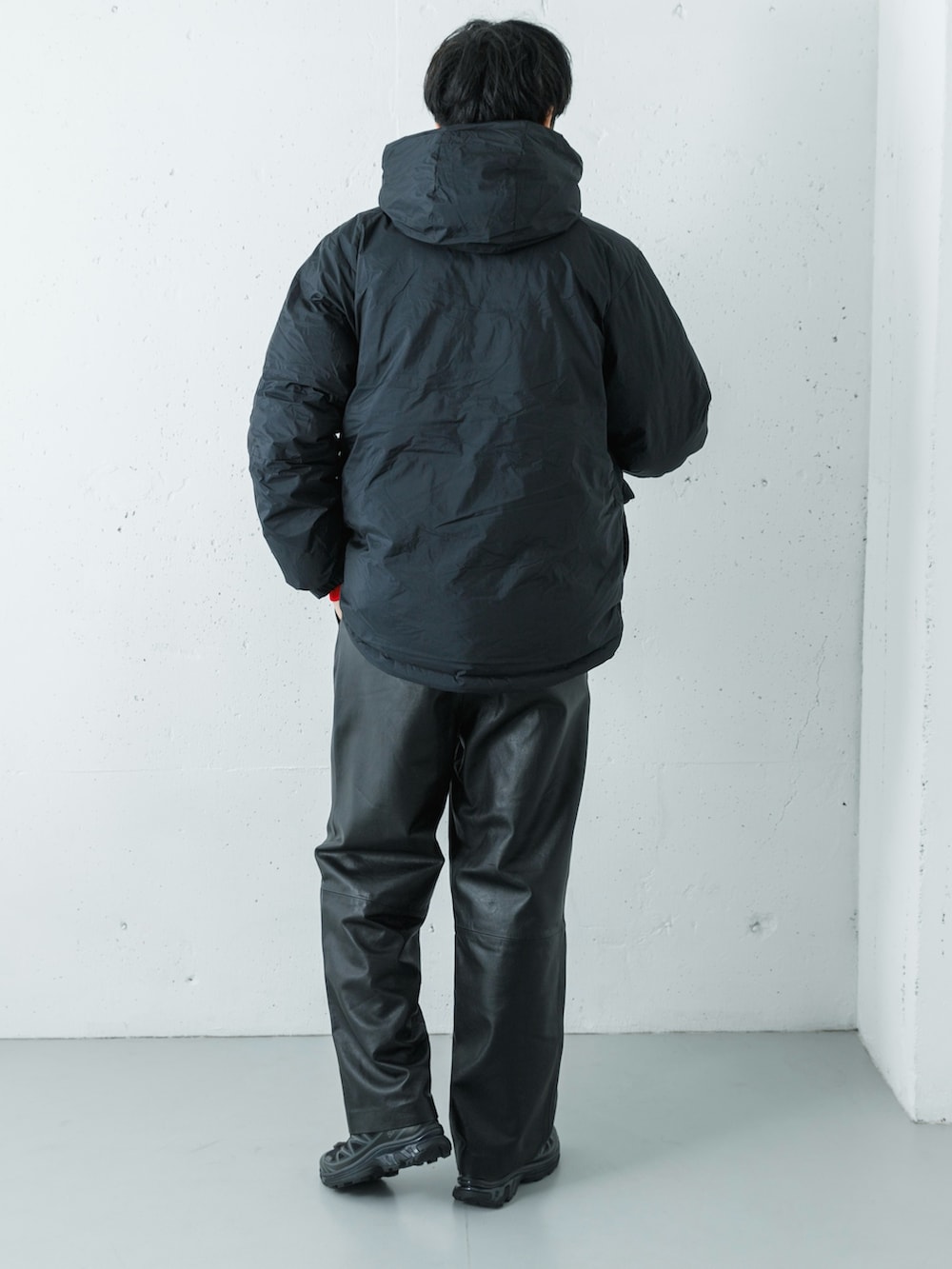 ボトムスには重厚なゴートレザーのトラウザーを選び、上下のブラックトーンで統一感を持たせました。
