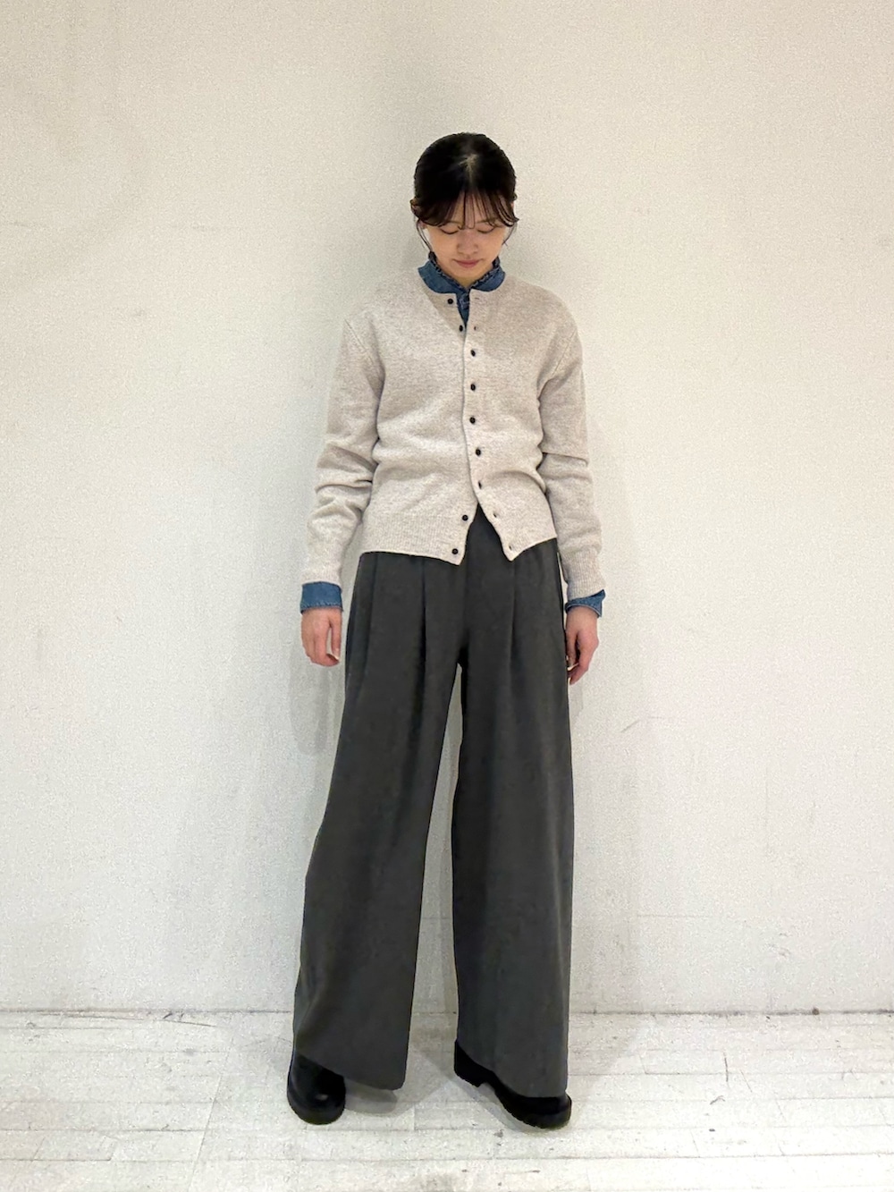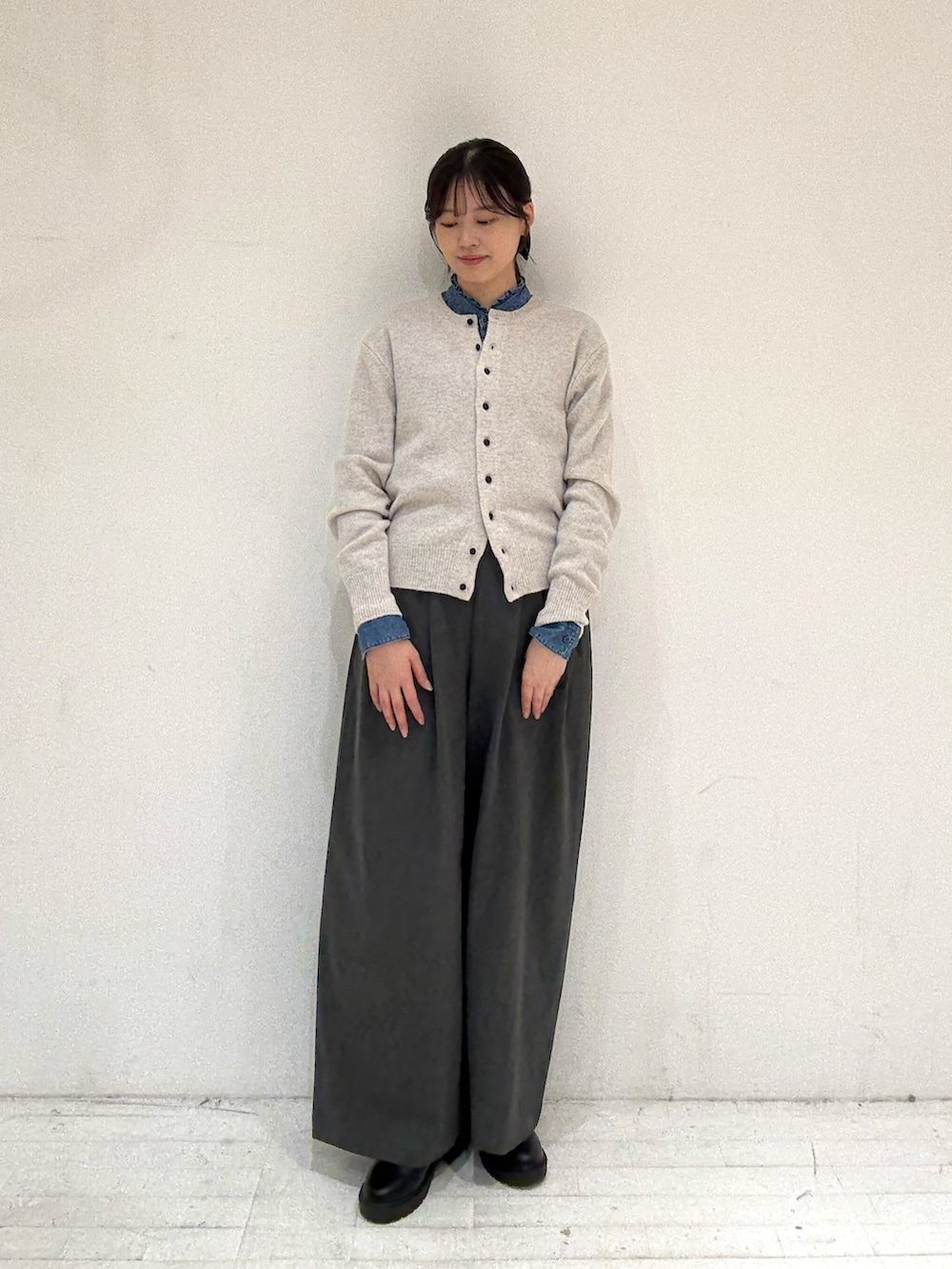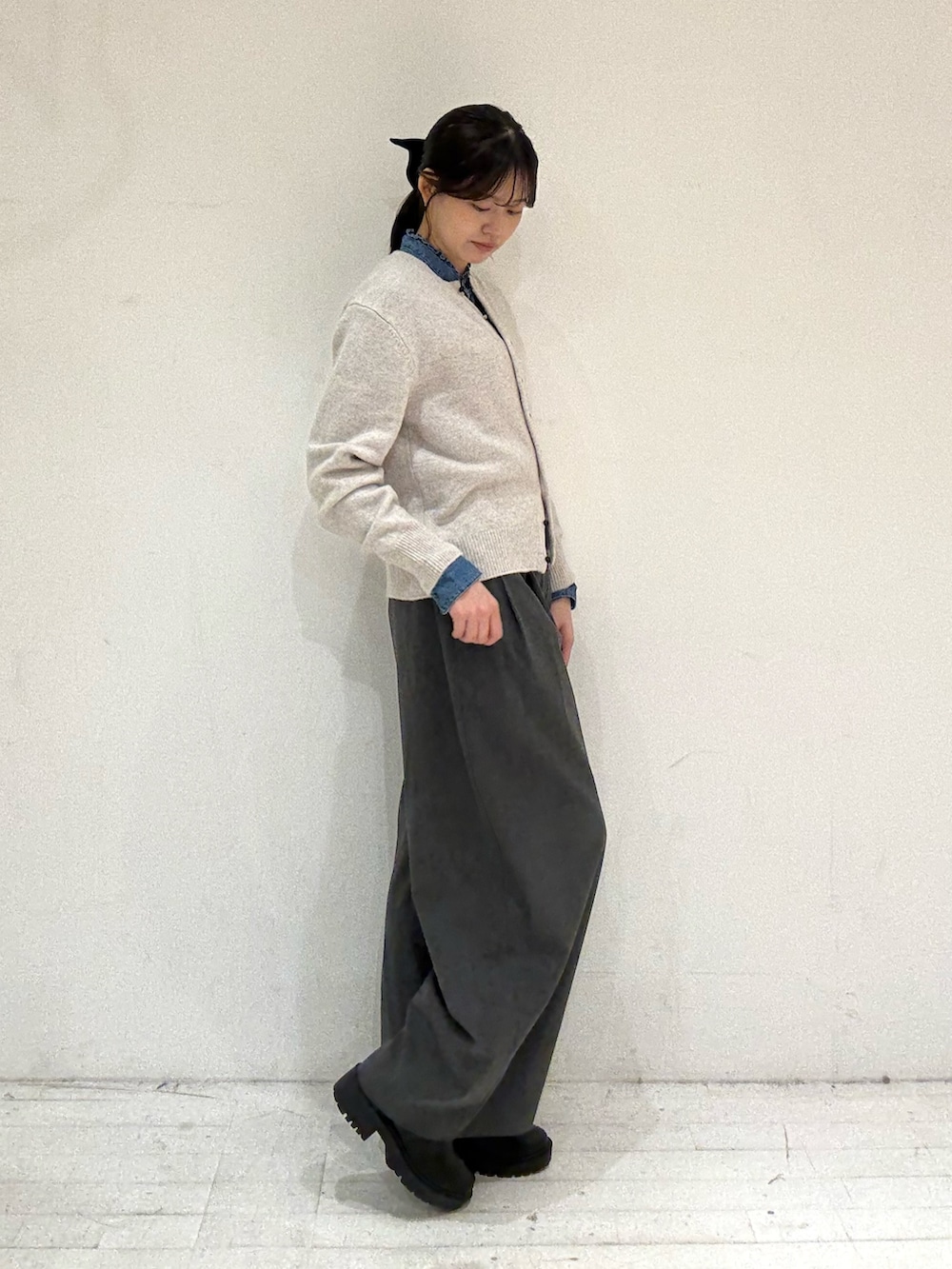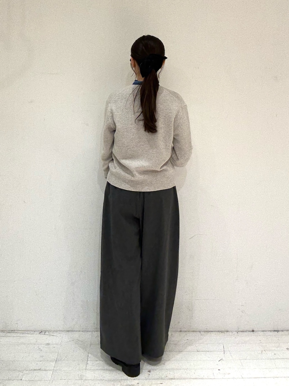 落ち着いたトーンのワイドパンツで、ナチュラルな印象に。