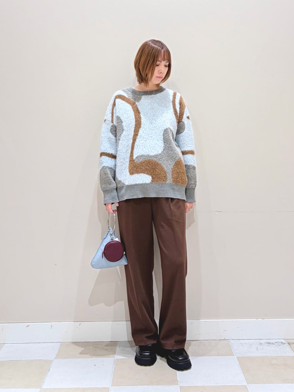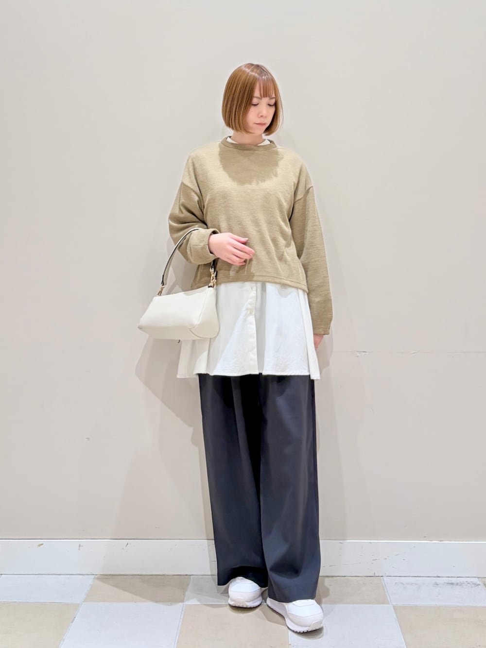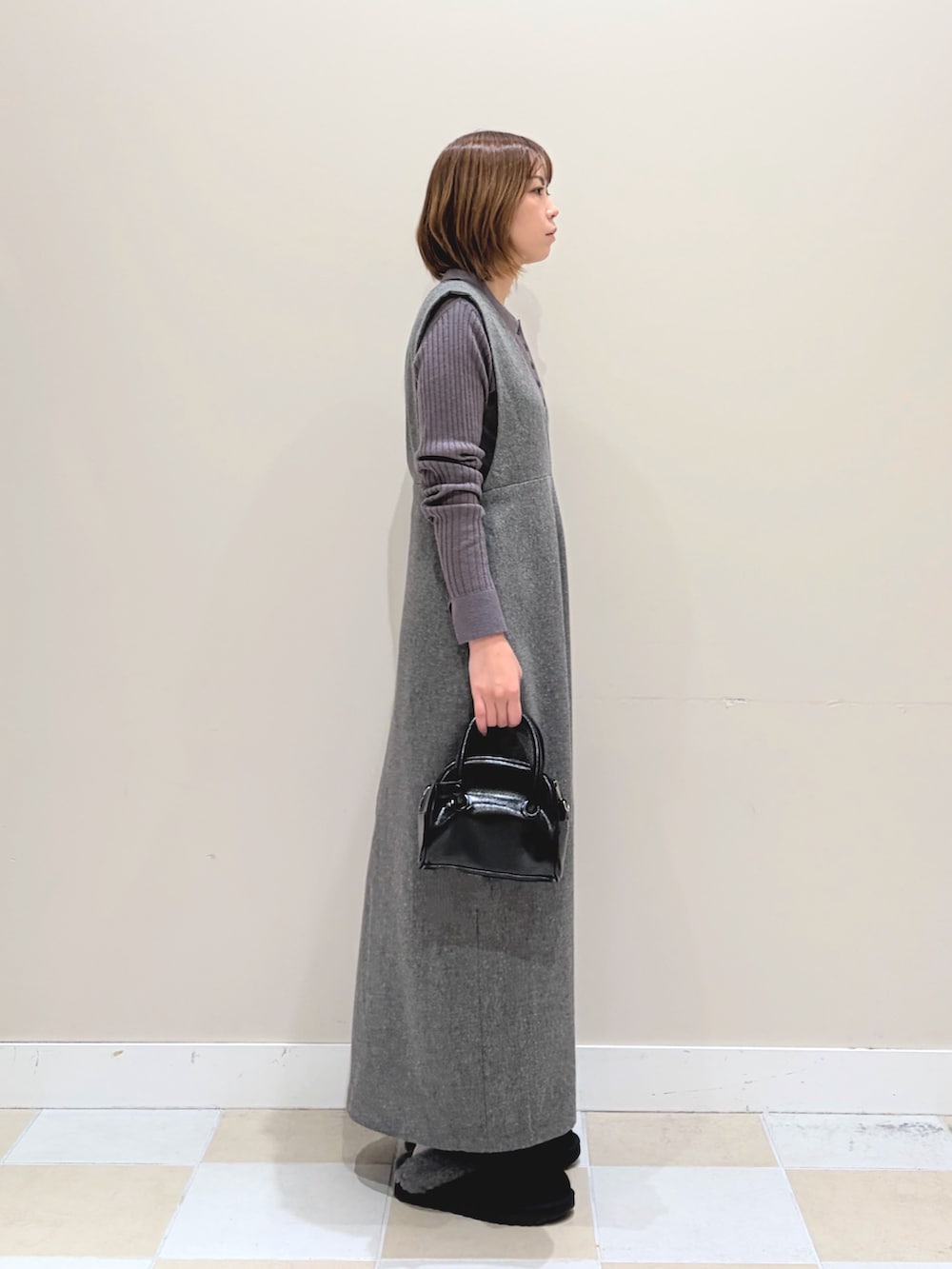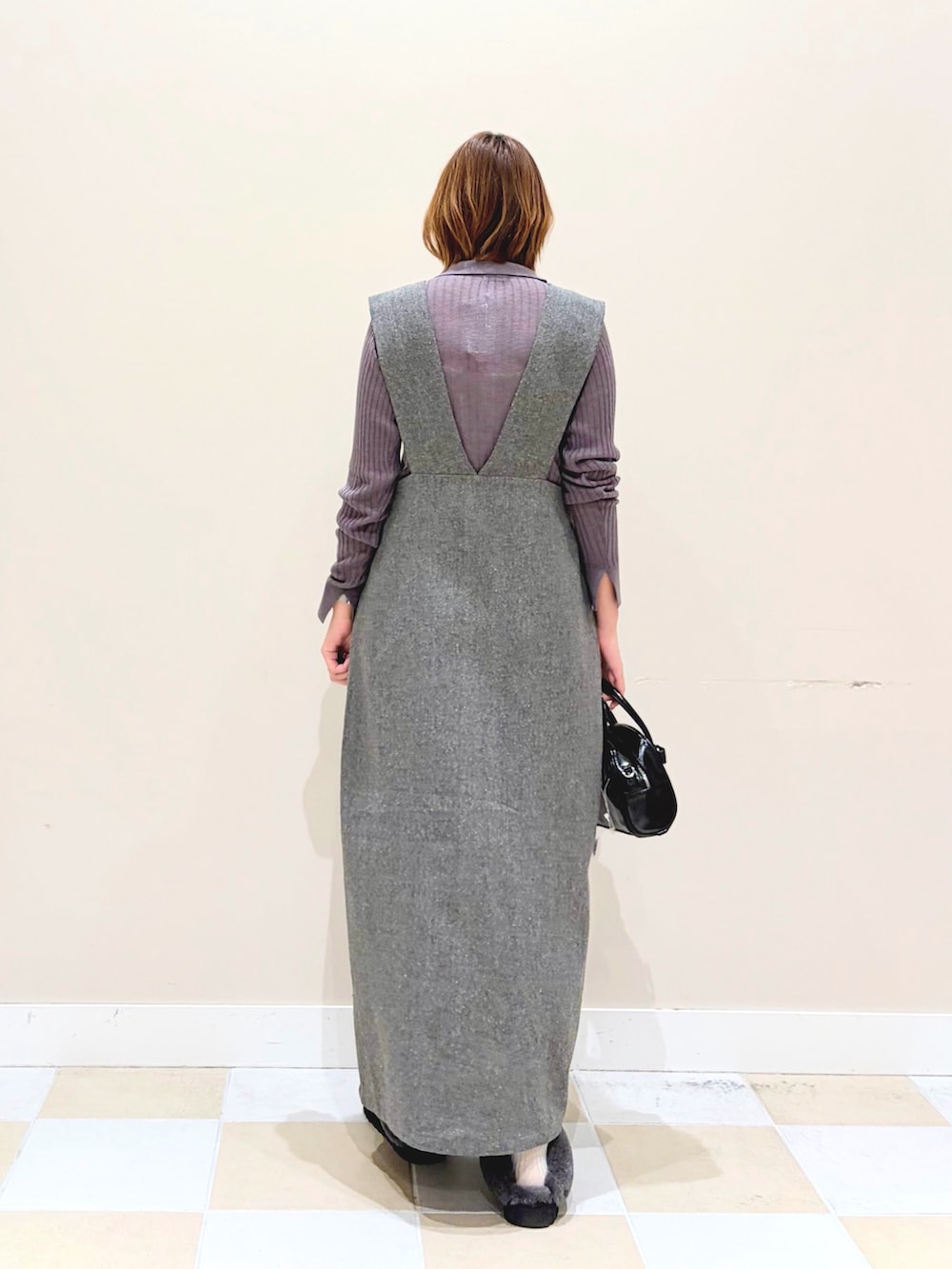 カジュアルな雰囲気で秋冬らしい素材のゴマツイードジャンスカにシアーリブポロニットでイージーなスタイルにしました。