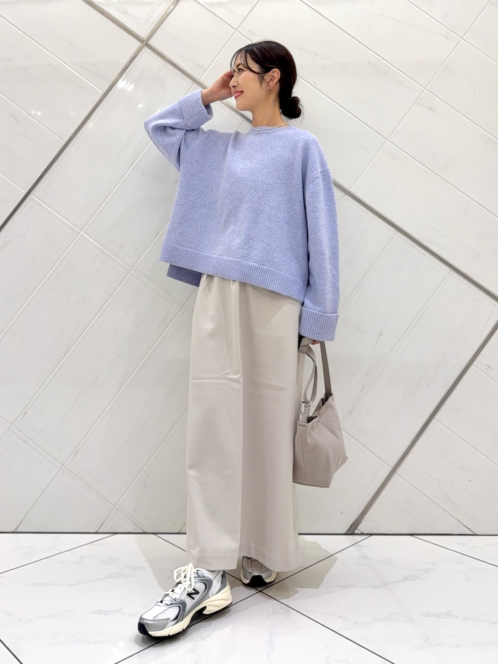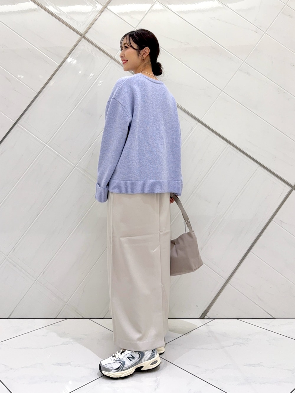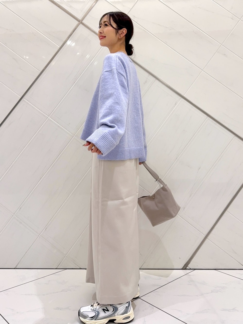淡いラベンダーカラーがコーディネートのアクセントになります。