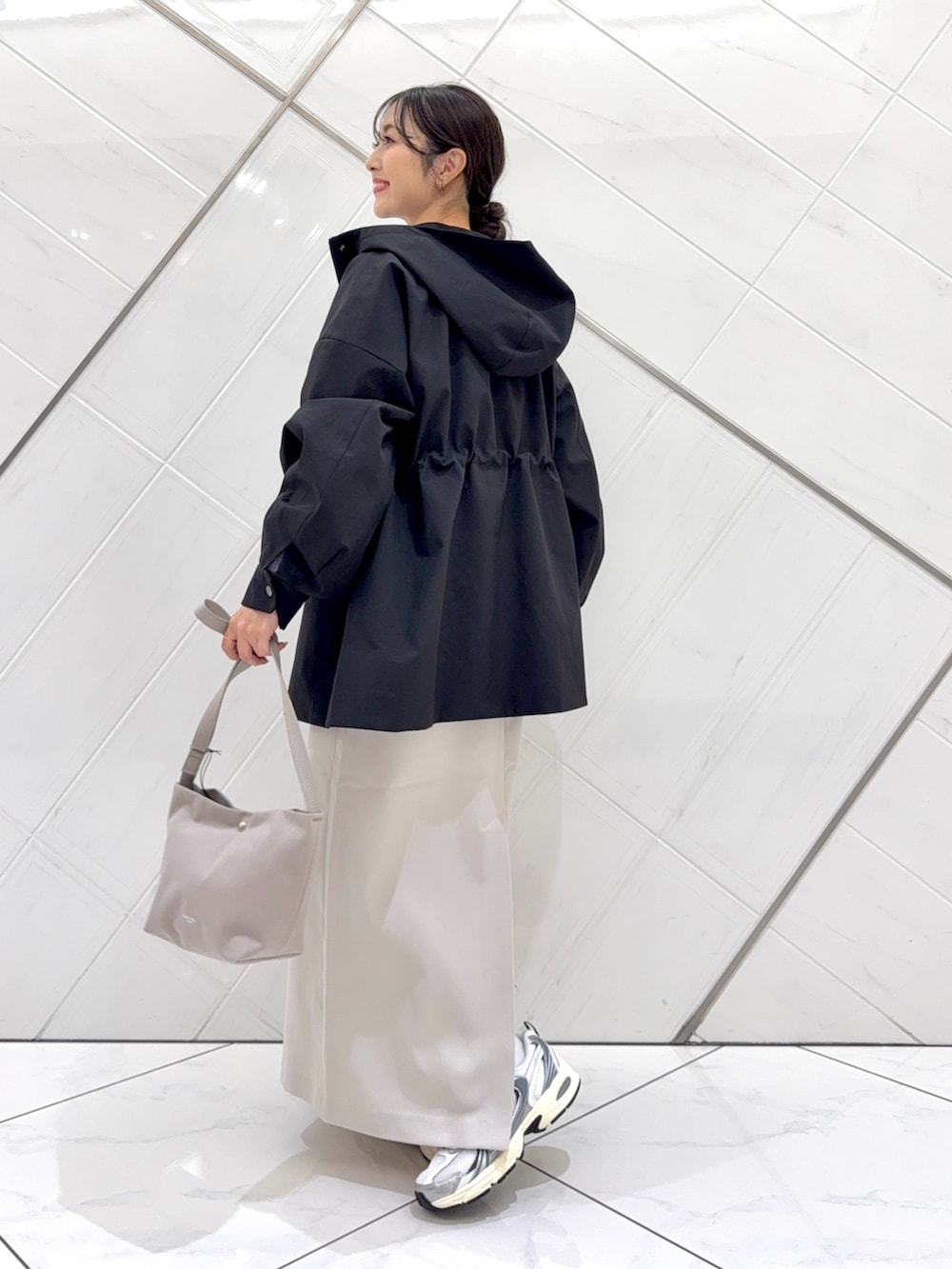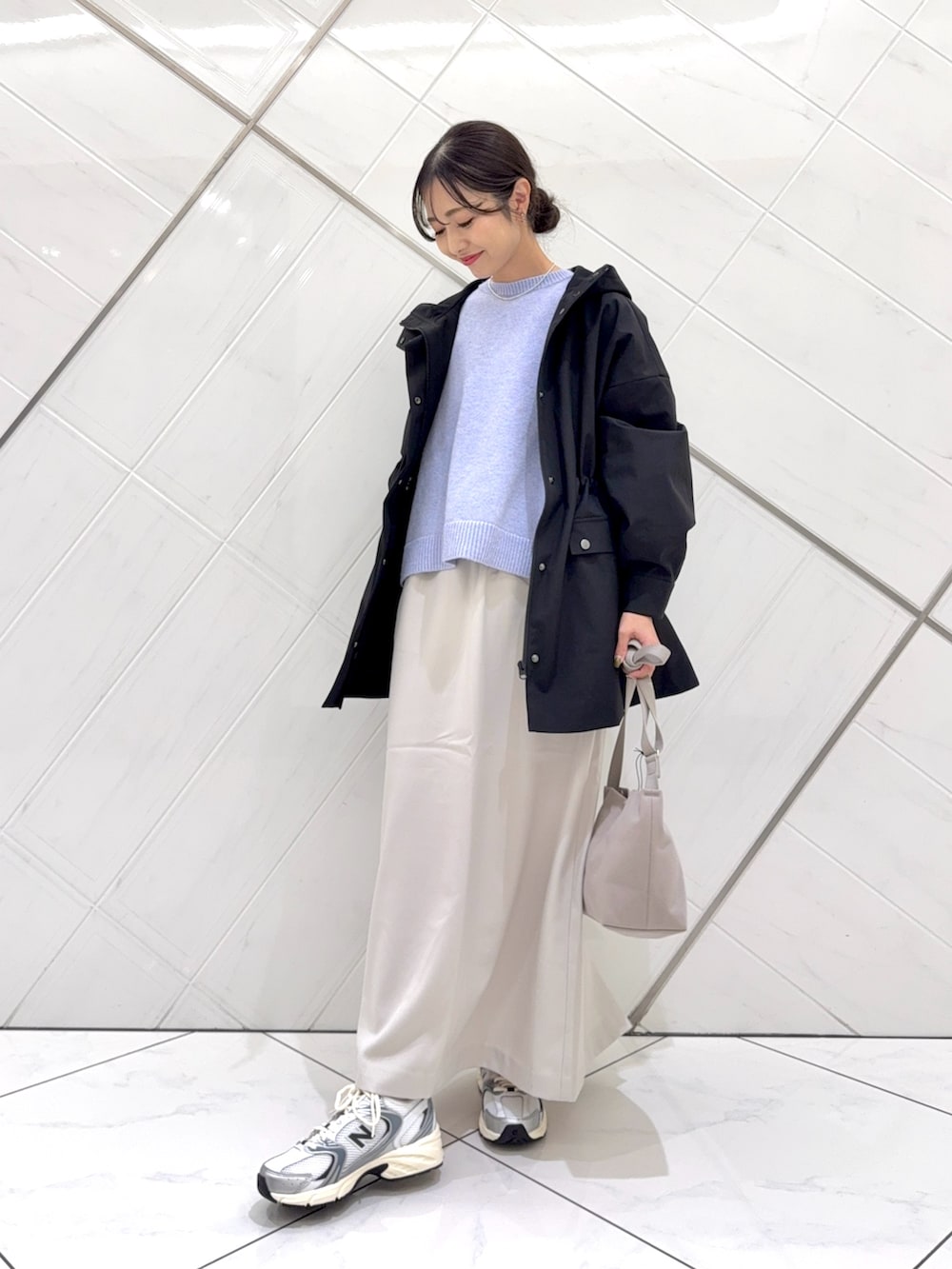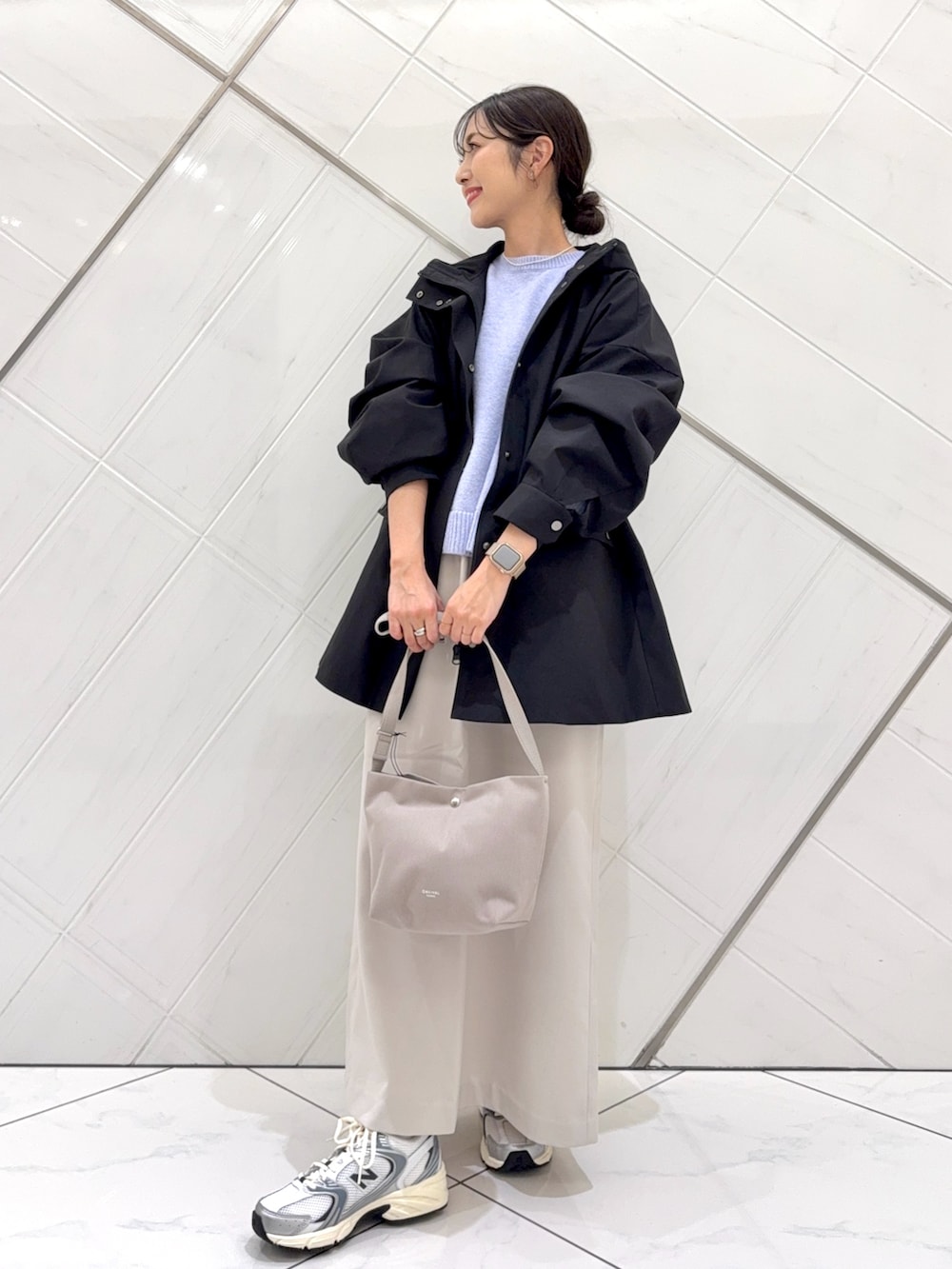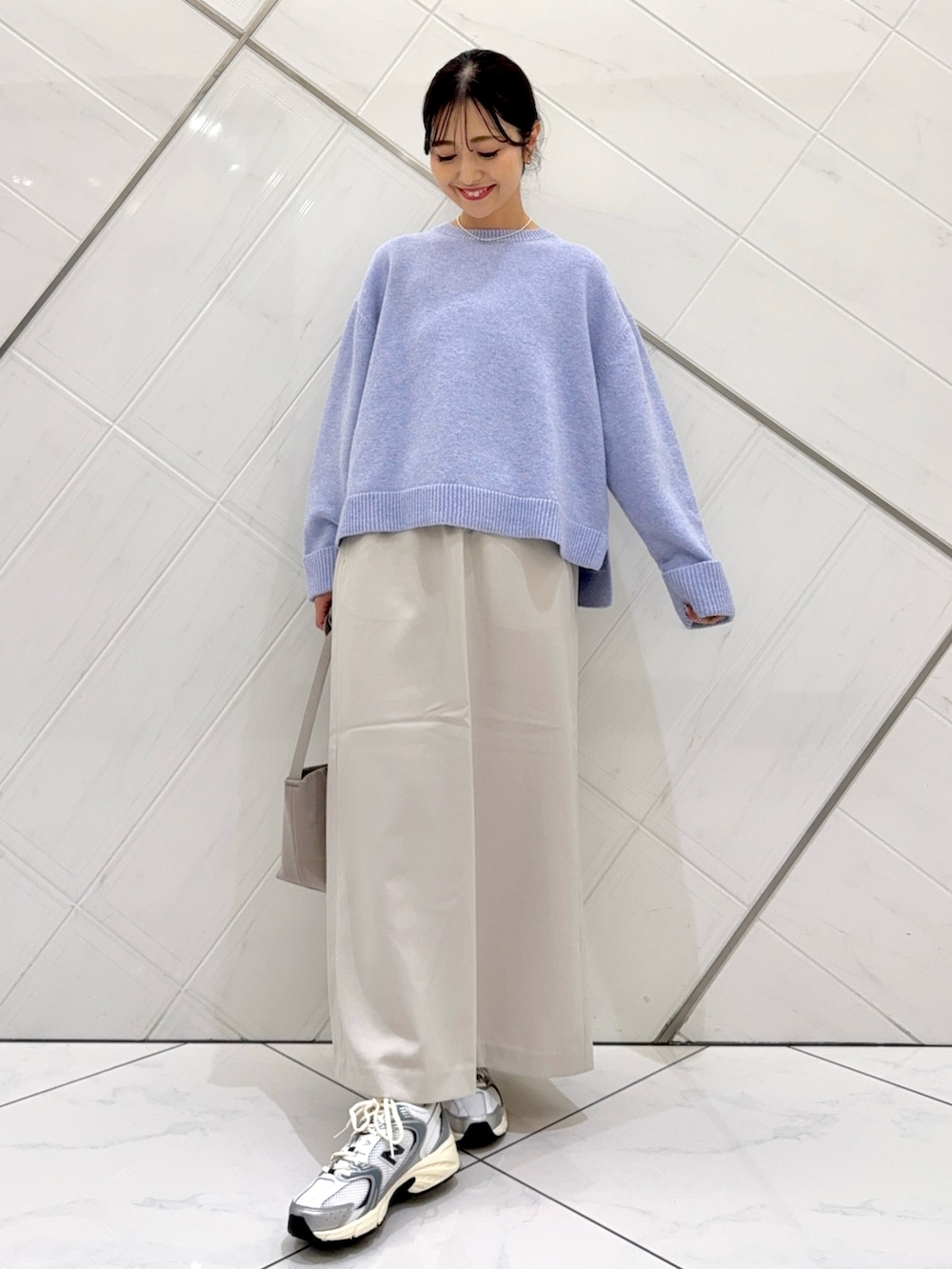 淡いラベンダーカラーがコーディネートのアクセントになります。