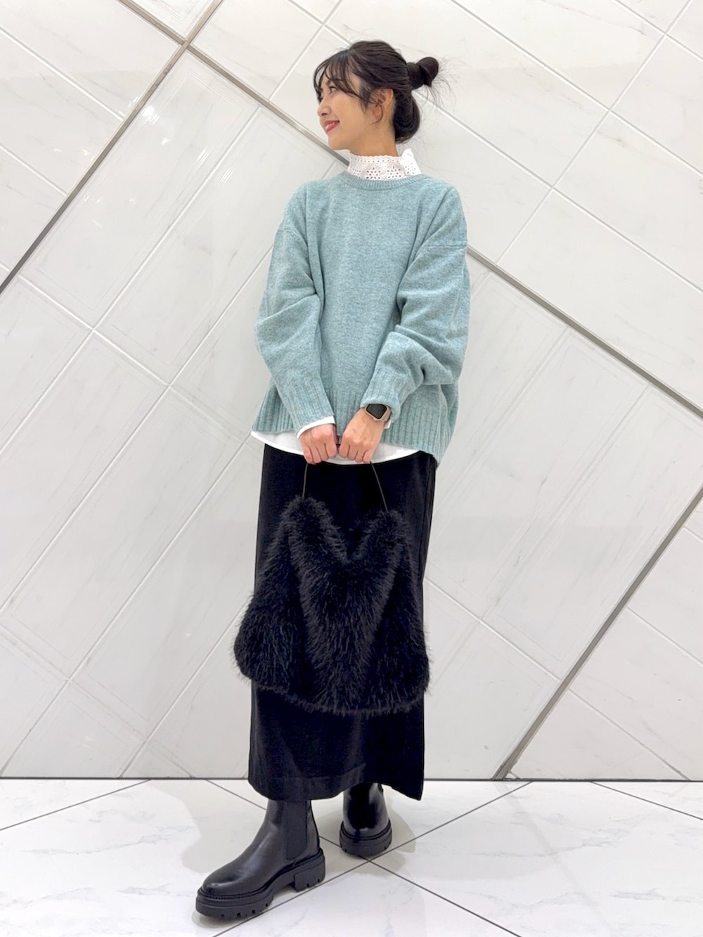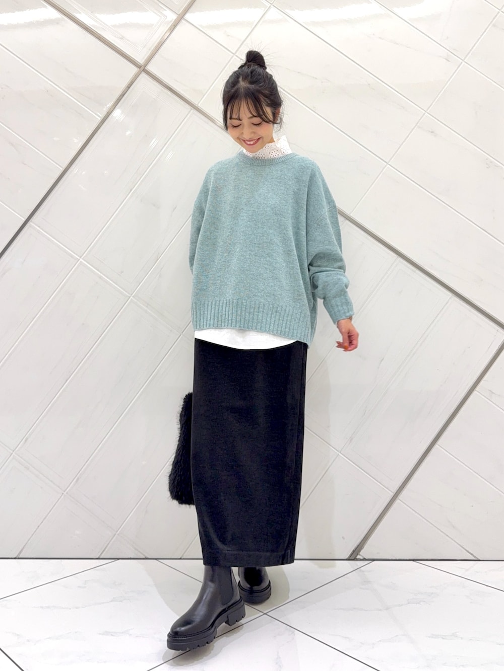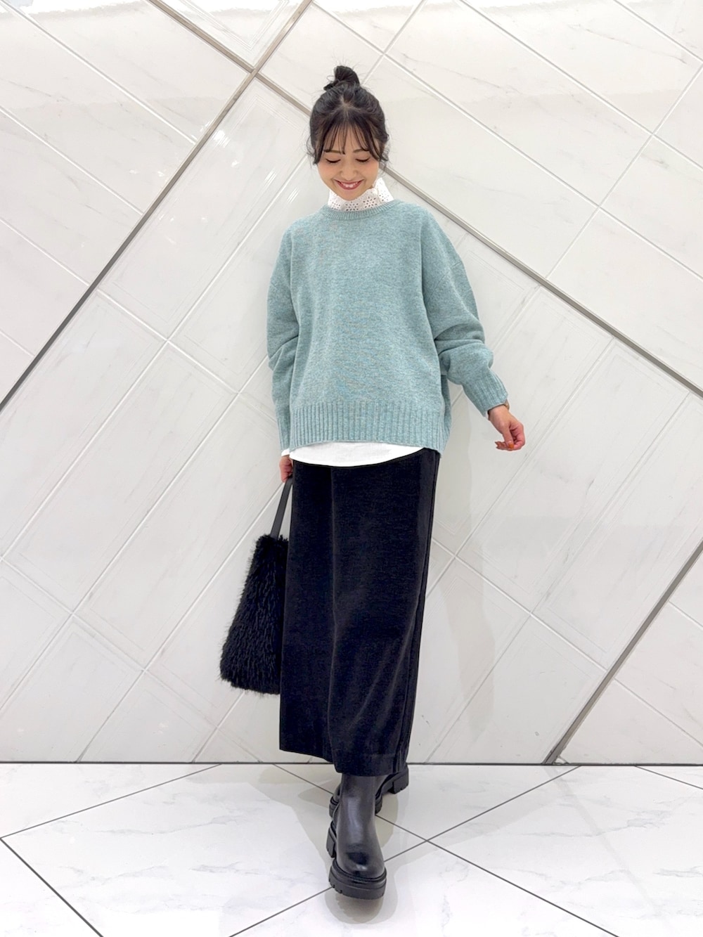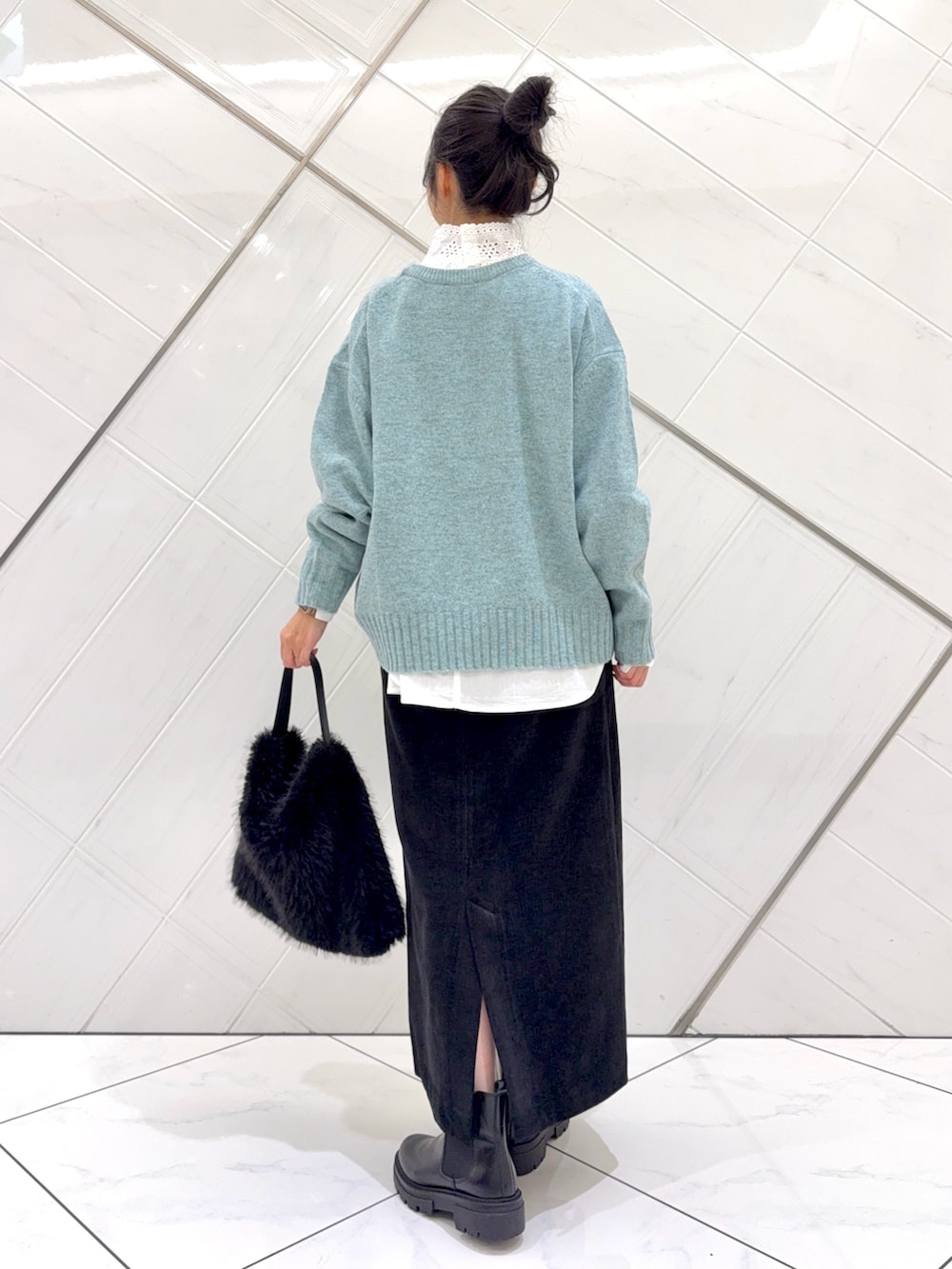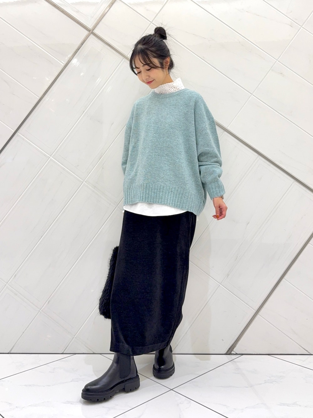 インナーにはアイレットレースのブラウスを着用しており、コーディネートのアクセントになって可愛い1着です。