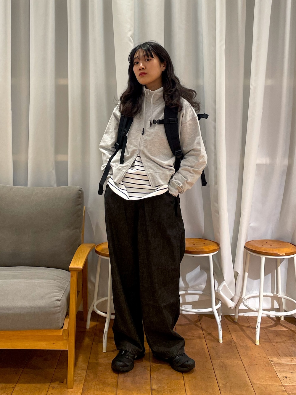 トップスは別注championのスウェットを合わせてとことんカジュアルに!