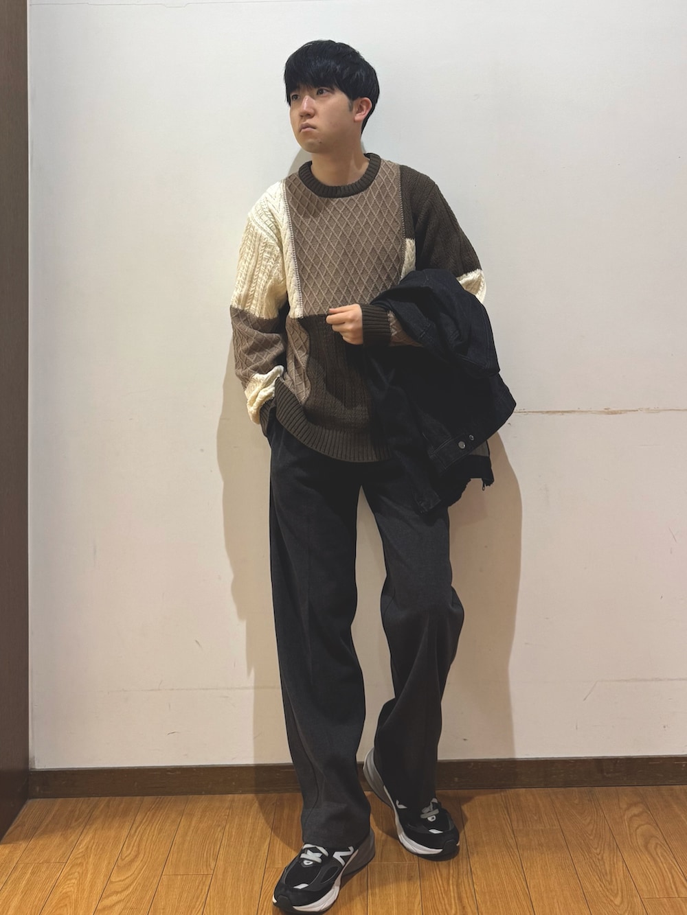 ニットだけだとカジュアル感がかなり強くなってしまうため、デニムジャケットを使用して、カジュアル感を抑えてキレイめに見えるようにしております。ニット1枚でかなりあ暖かいので、ちょっとした羽織物が、合わせやすいです!