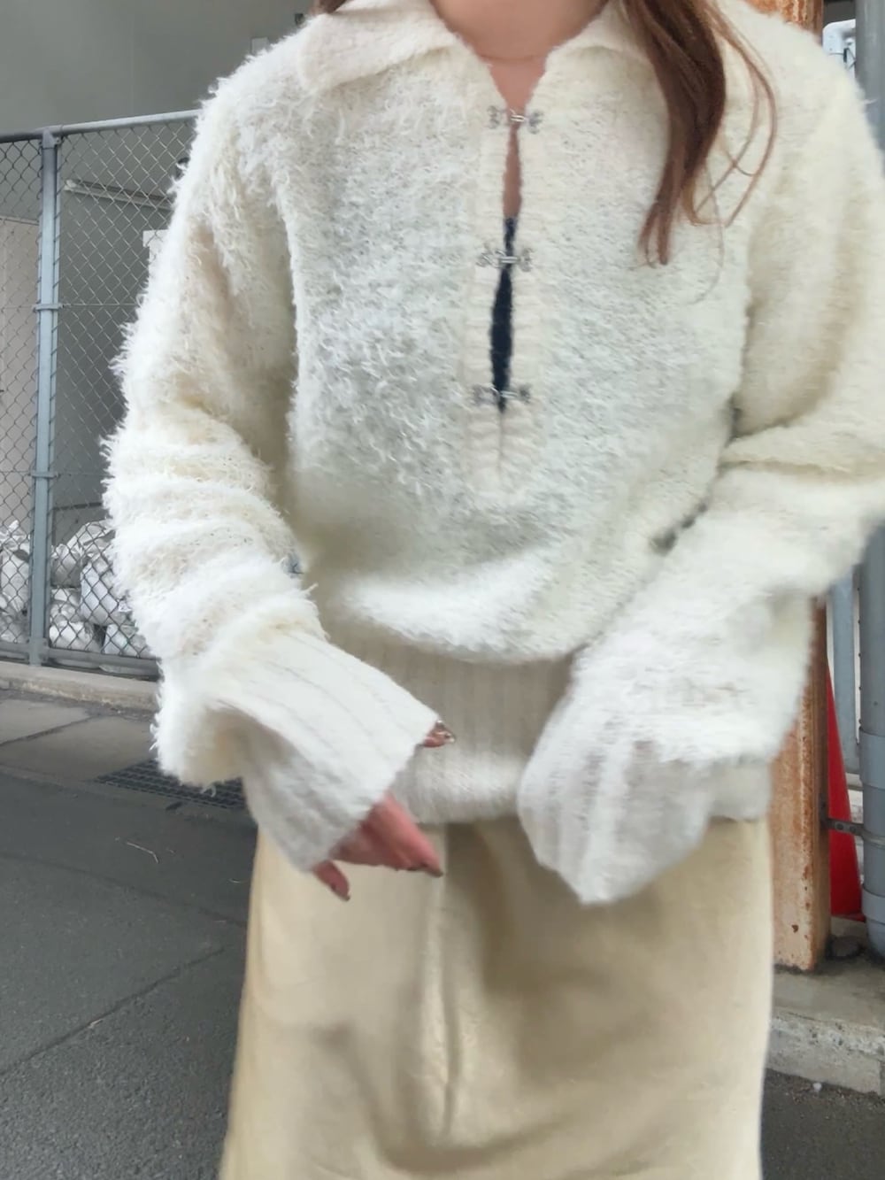 ホックのデザインが個性的で、一枚着るだけでおしゃれになれるニットです!
