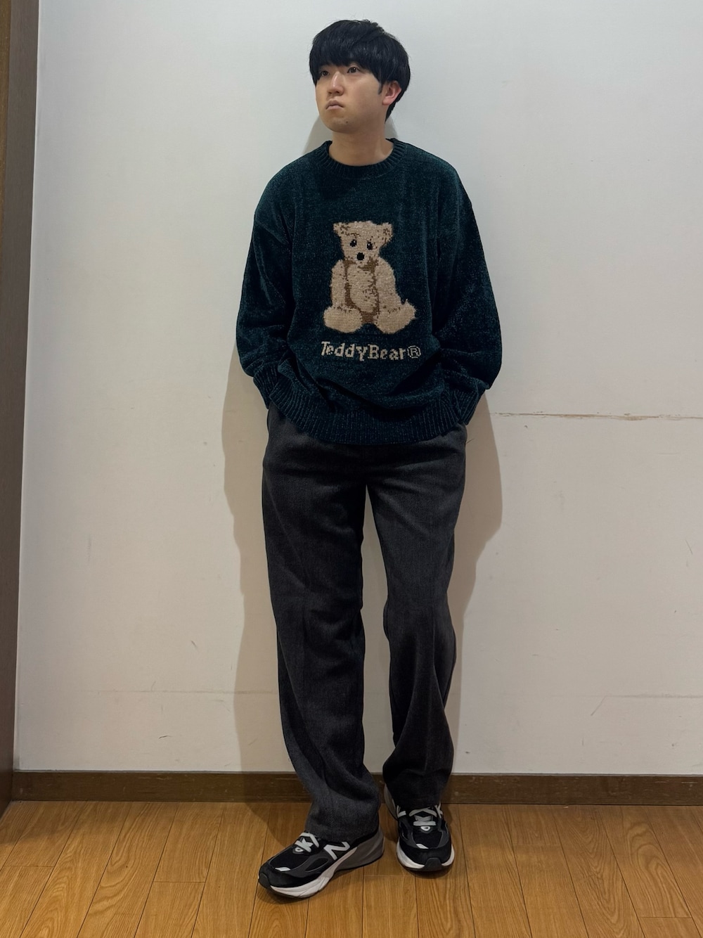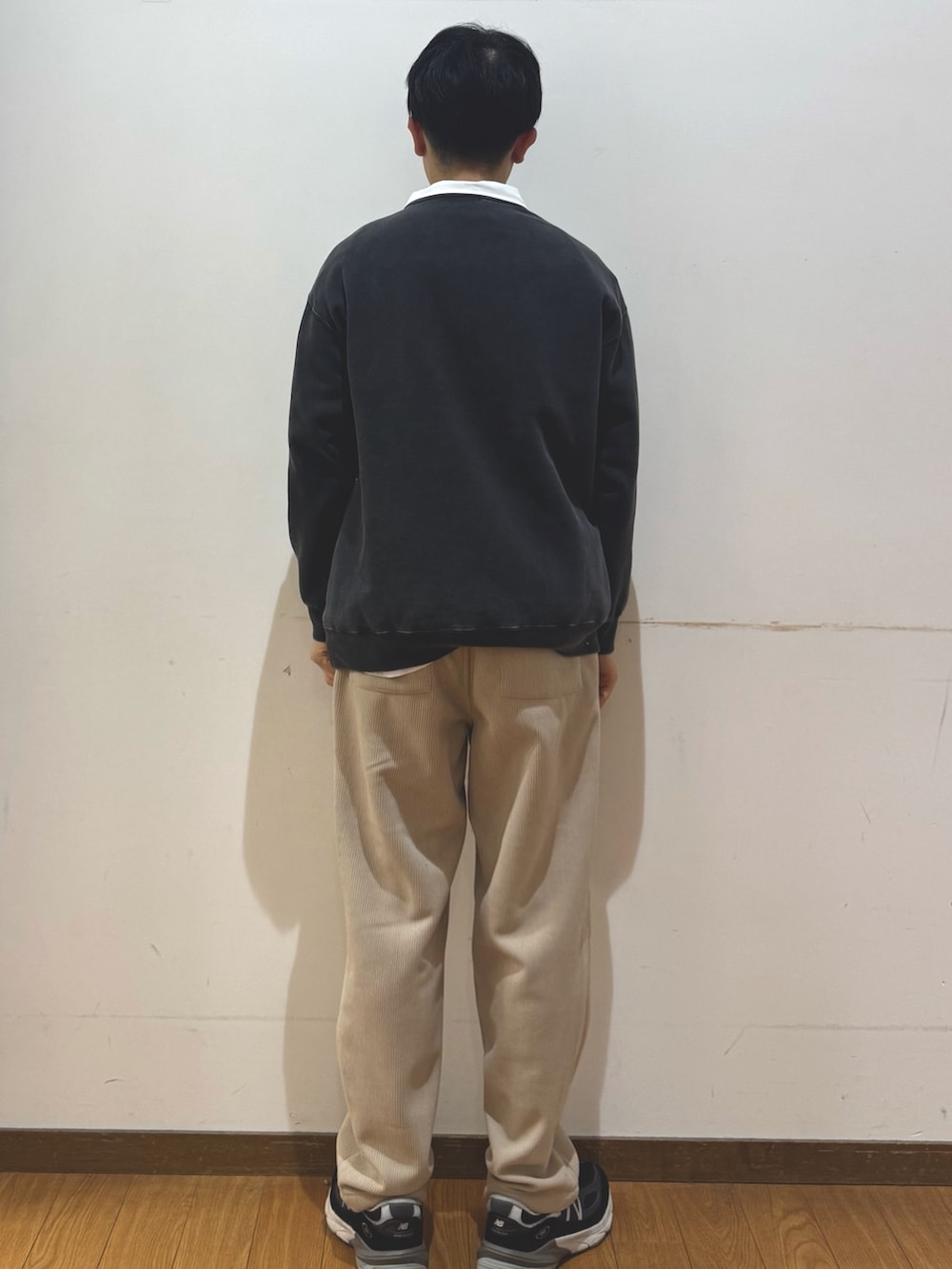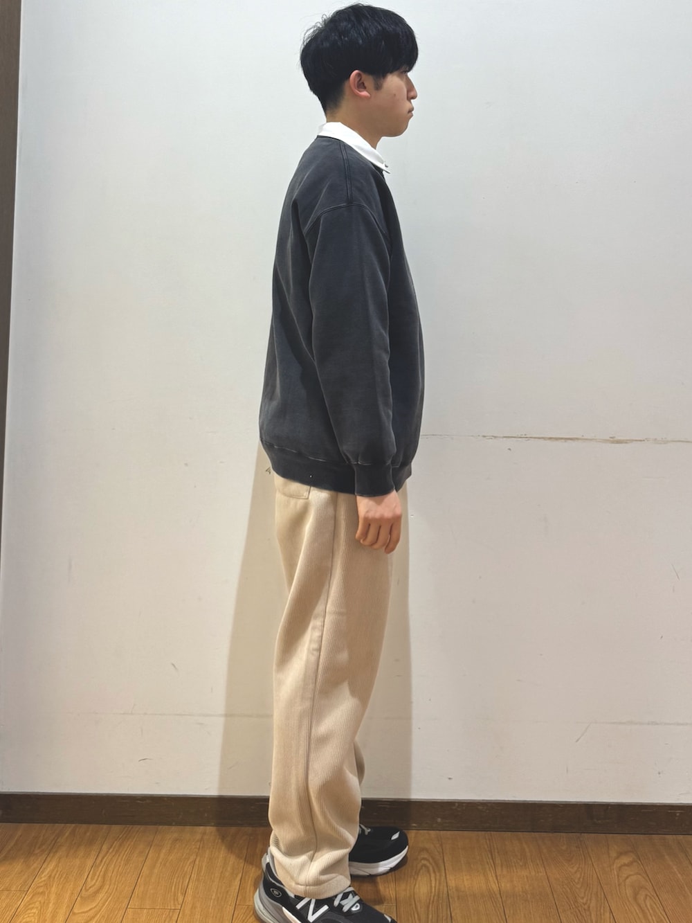 起毛スウェットにシャツを組み合わせてレイヤードコーデにしました