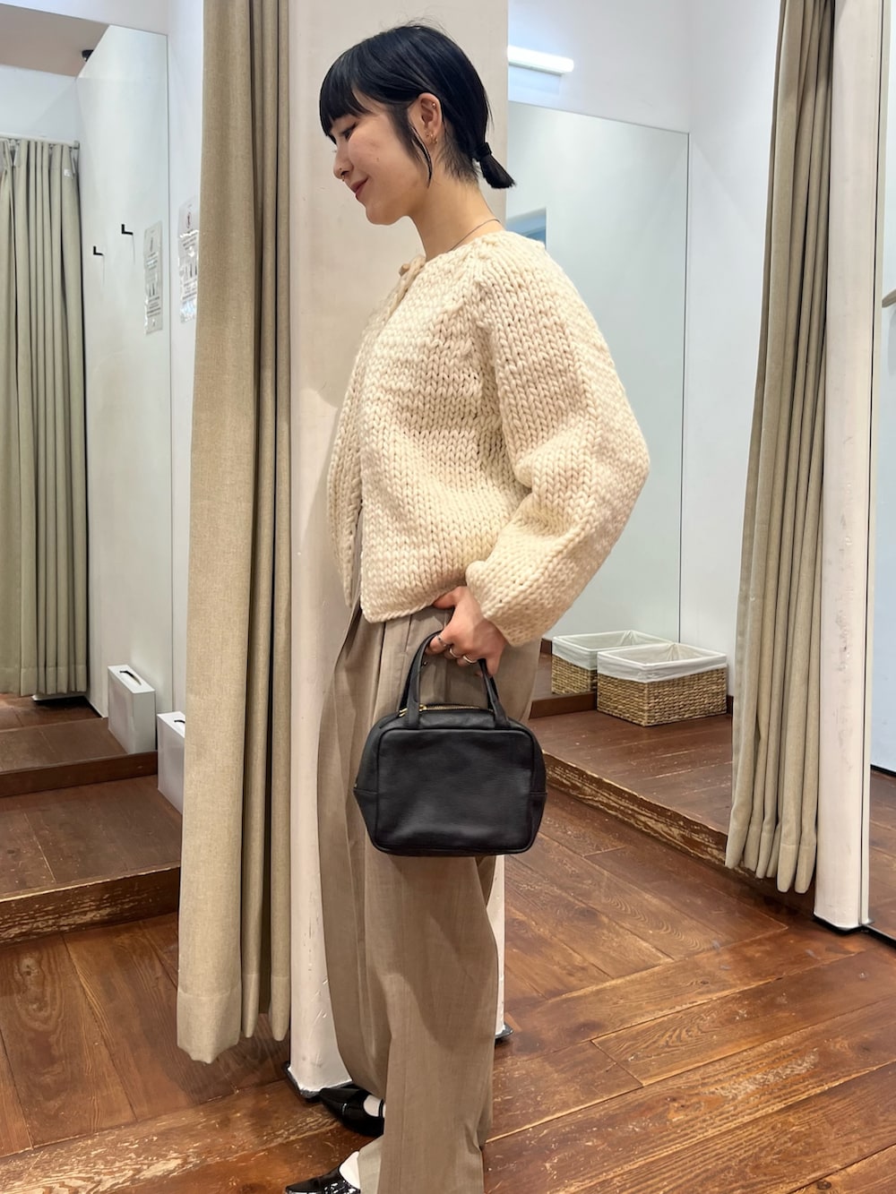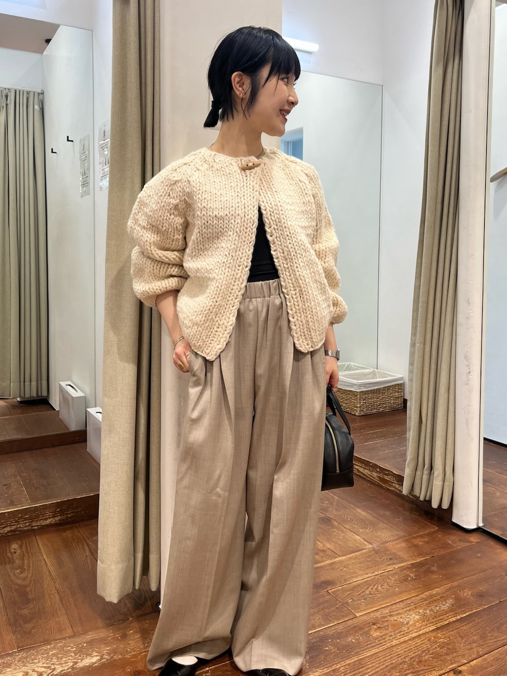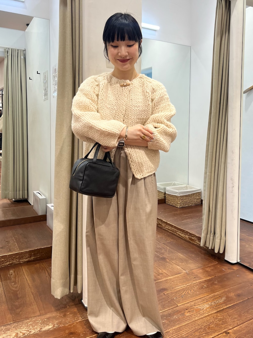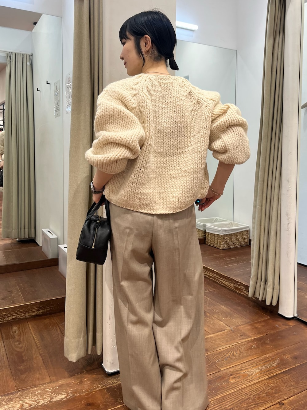 太めの糸で編み上げられたウール100%のカーディガンです。