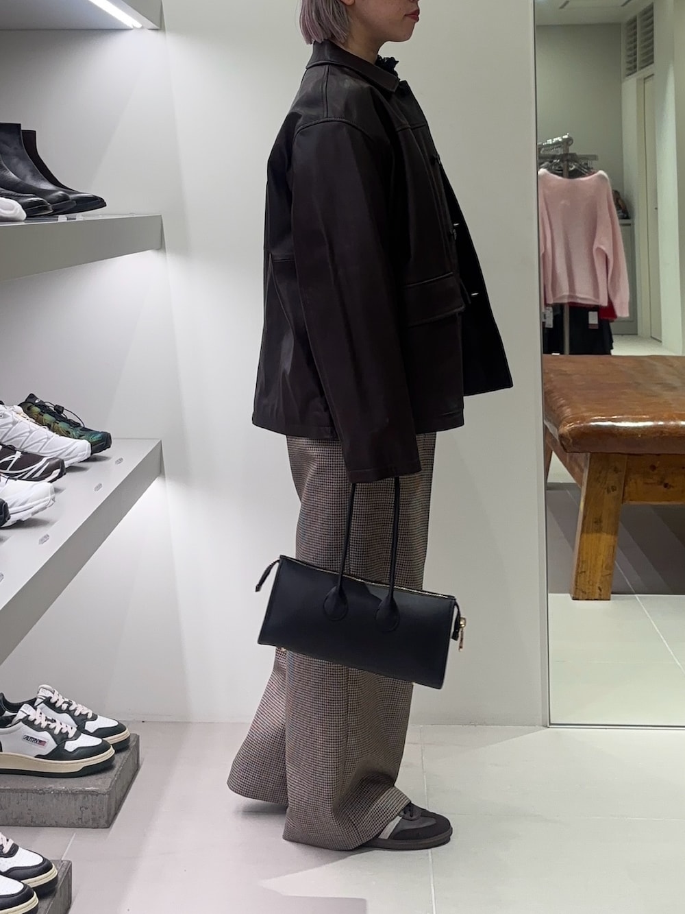 カッコよくなりがちなレザーもカバーオールのカジュアル感と金具のないこちらのデザインだと普段のスタイリングにも馴染みやすく、合わせやすいです。