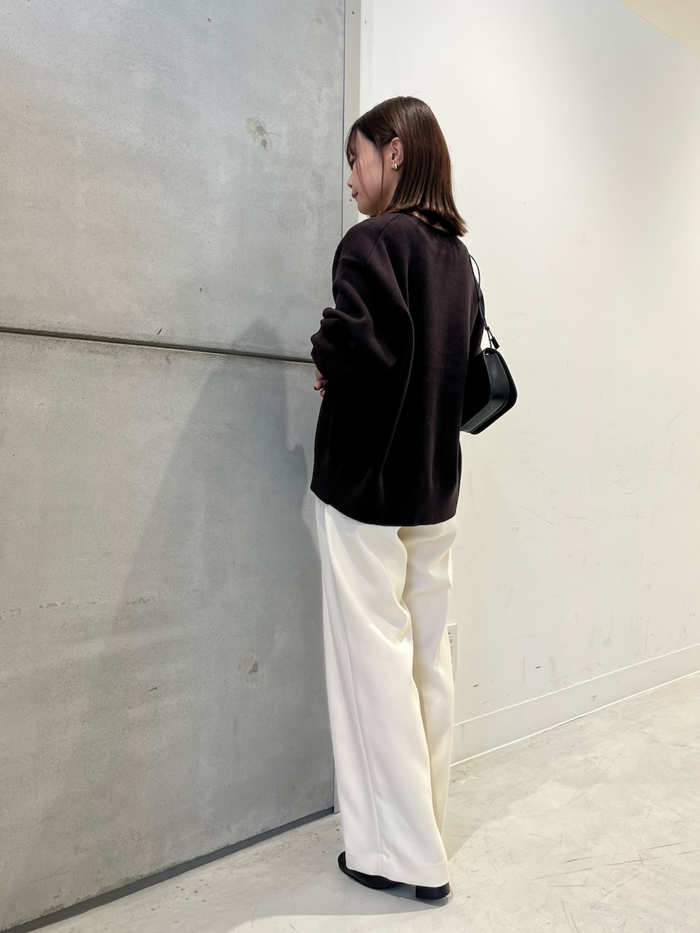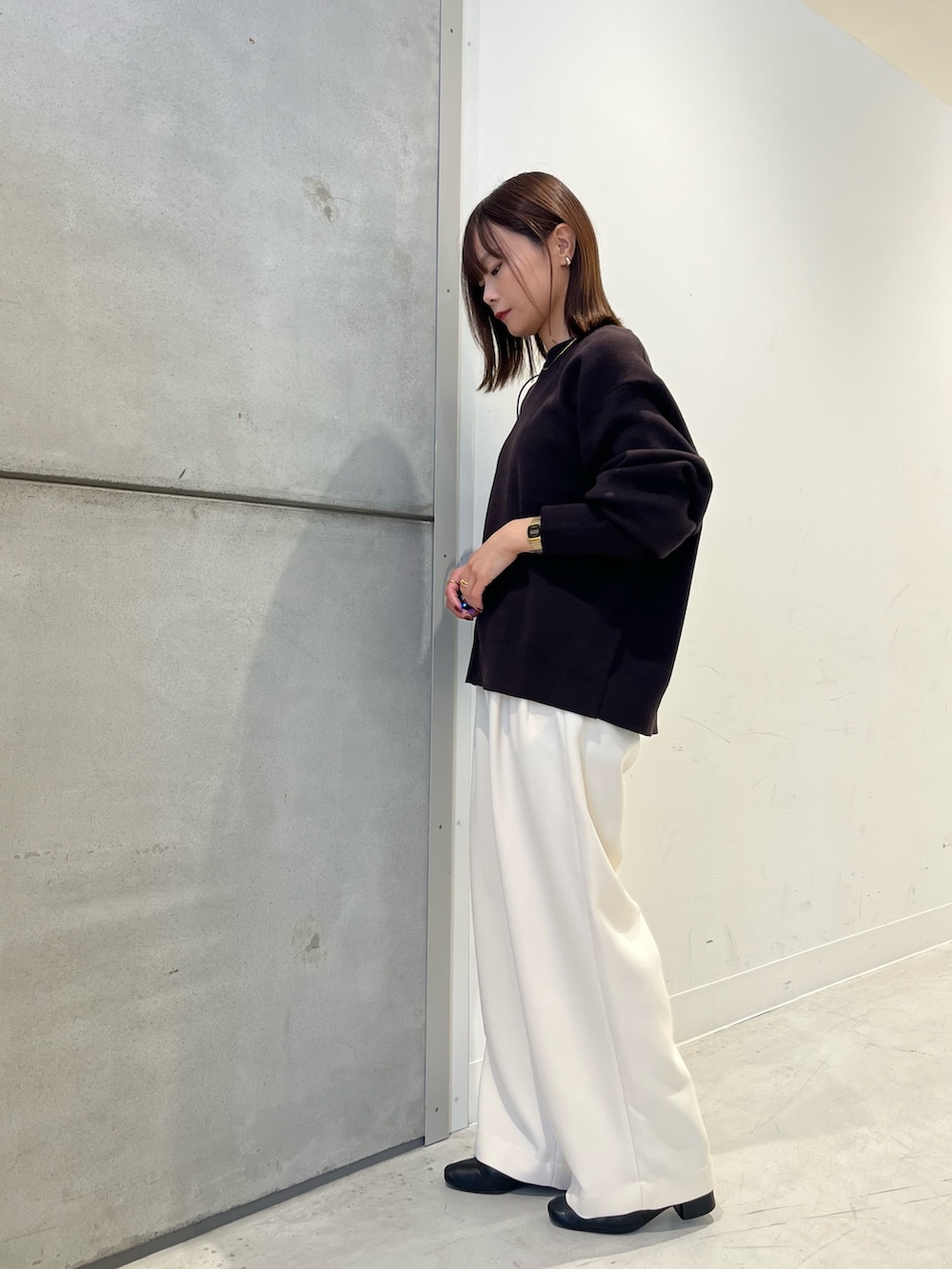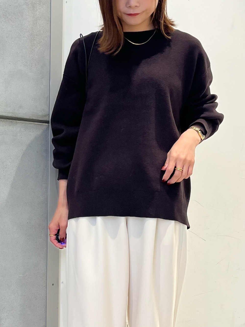 コットンカシミヤの肌触りの良いトップス。ブラウンも深めの色なので落ち着いた印象に。カジュアルになりすぎずに合わせれます!