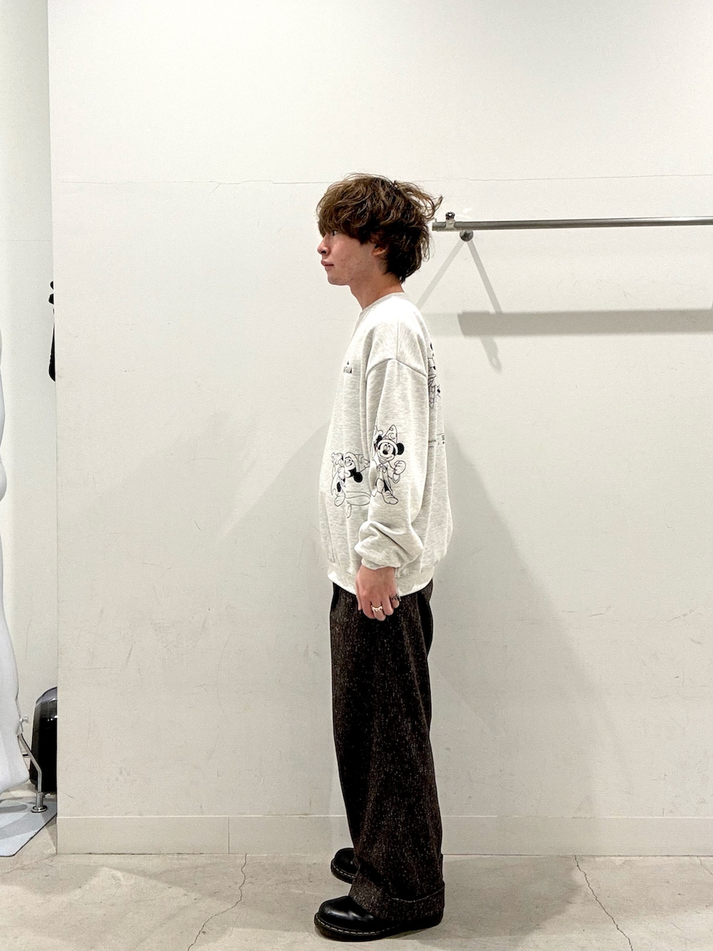 ミッキーのプリントがたくさん入ったスウェットにダボっとしたボトムスで緩くまとめてみました!袖部分にミッキーがいるのがポイントです!