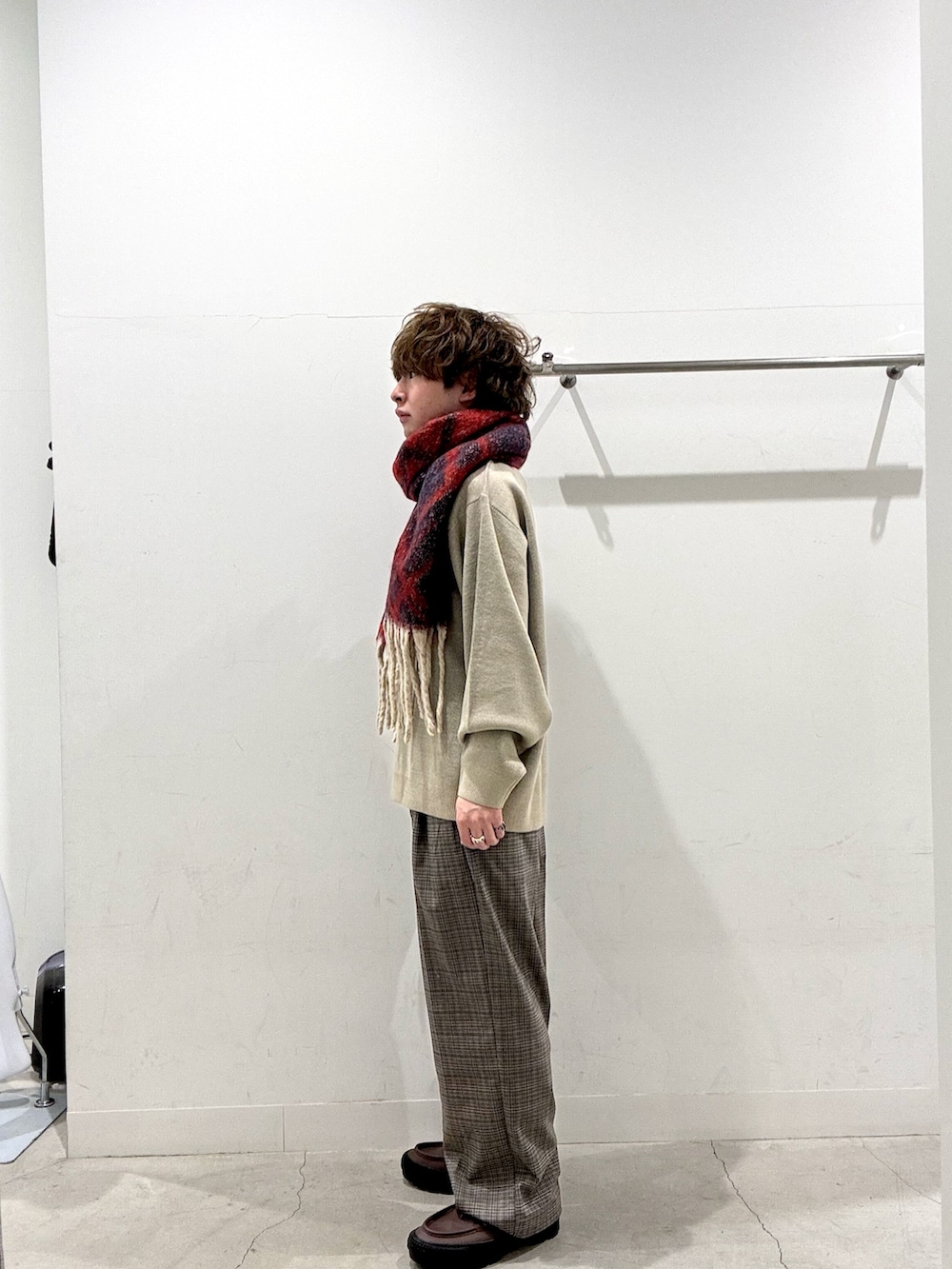 ロゴの入ったニットにチェック柄のパンツを履いて、差し色に赤のマフラーを巻いてみました!顔色が明るく見えて、マフラーで小顔に見せることができます!