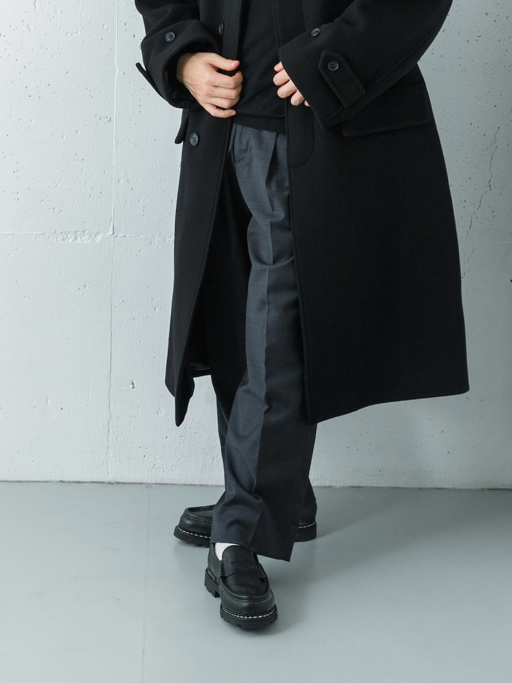 スラックスも上質なウール素材で太さはややありますが柔らかさと光沢感がきれいなコーディネートにマッチします。