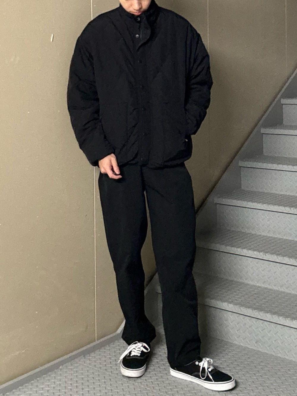 このコーデは、全身をブラックで統一したミニマルなストリートスタイル。