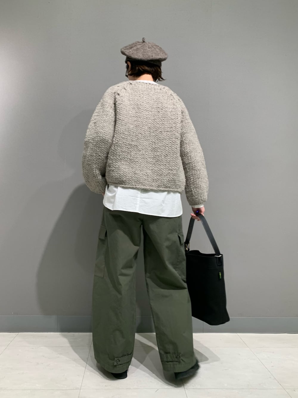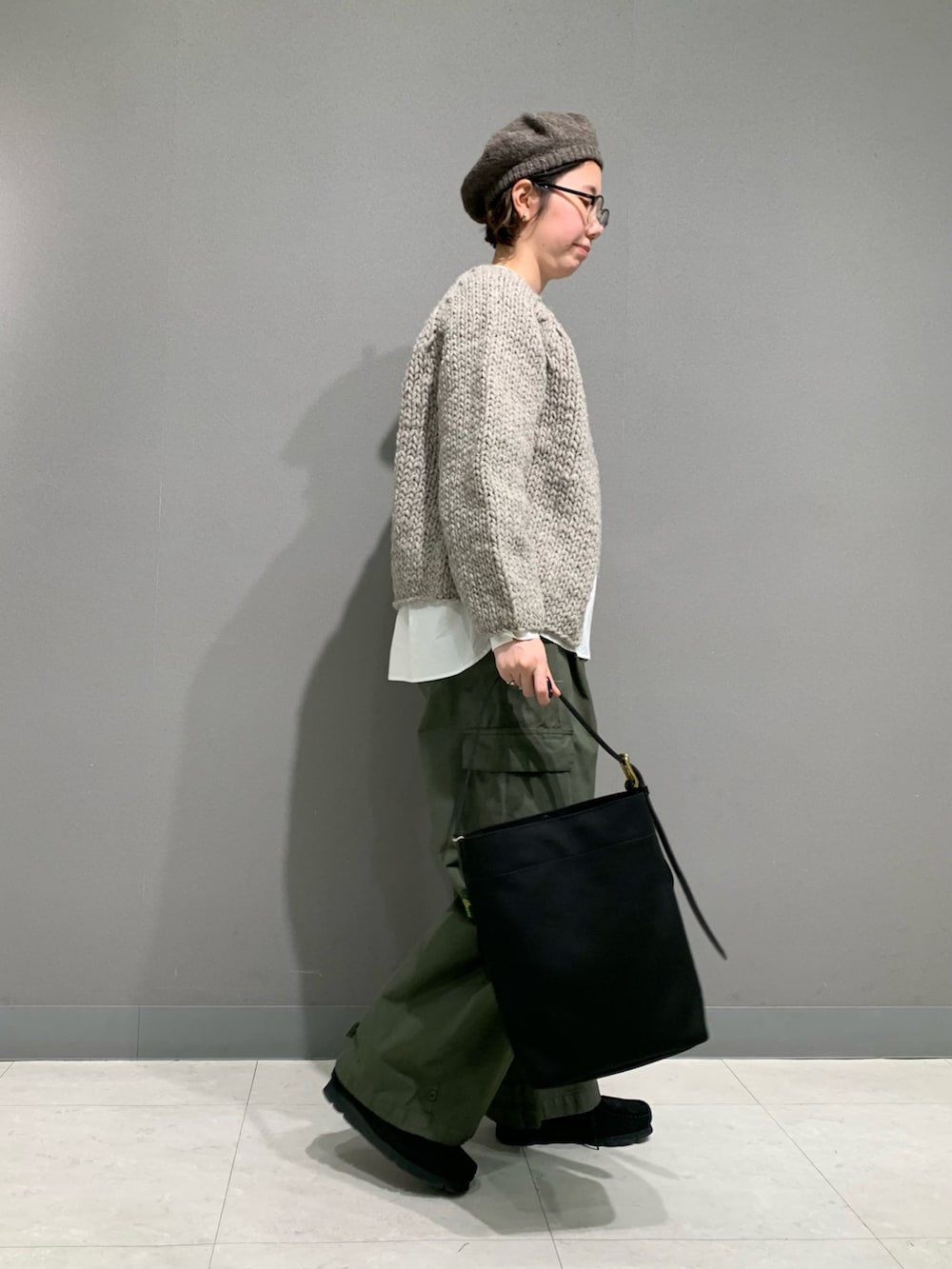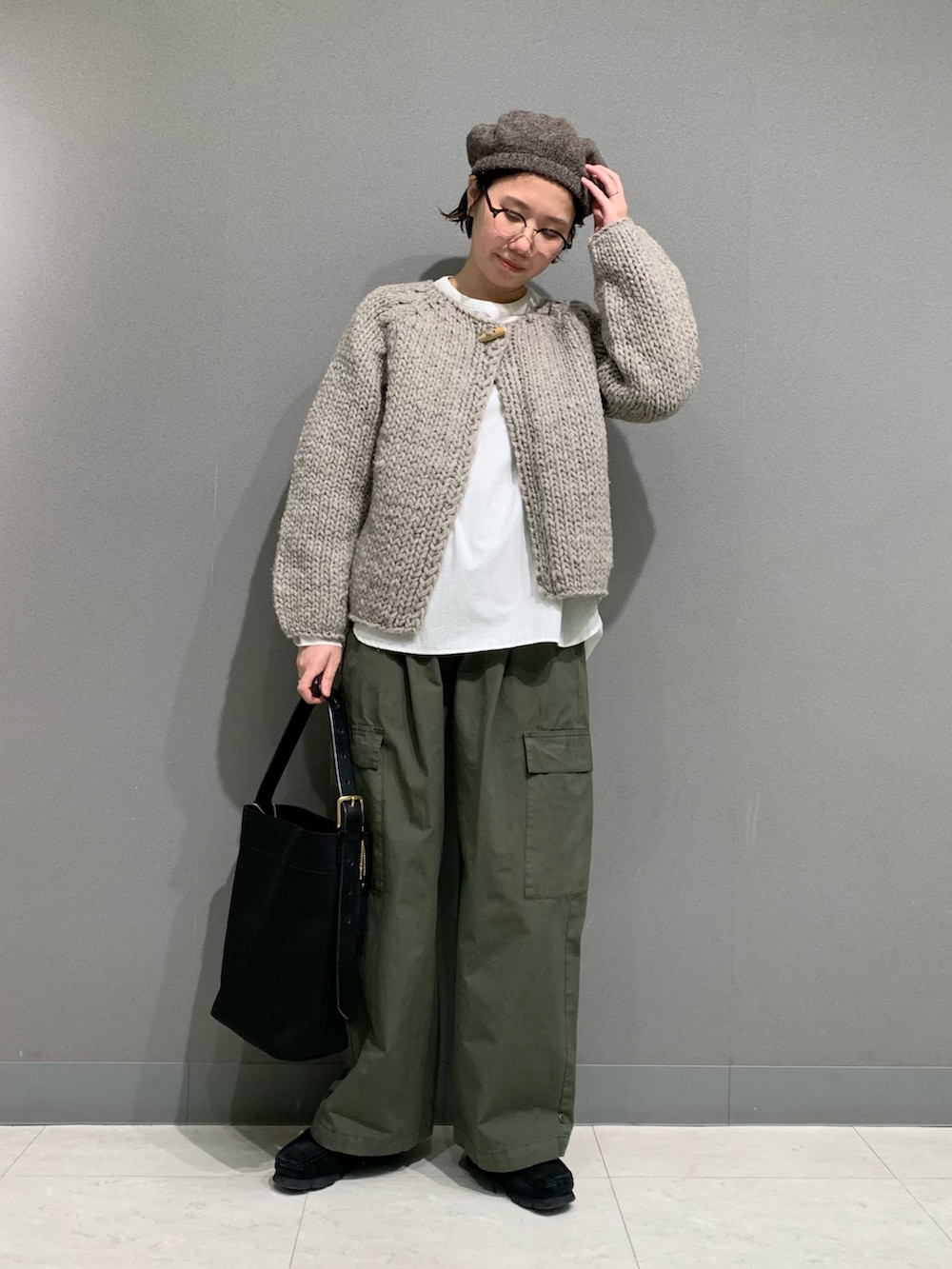 トグルの付いた可愛らしいカーディガン。少し可愛らしい印象なためカーゴパンツで甘過ぎないように組み合わせています。ローゲージのふっくら感が他のペルーニットシリーズとも違って素敵です。