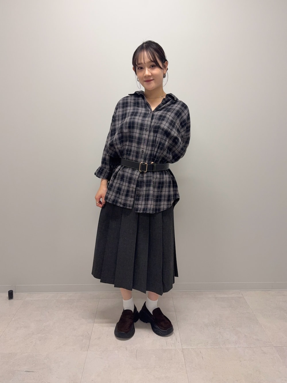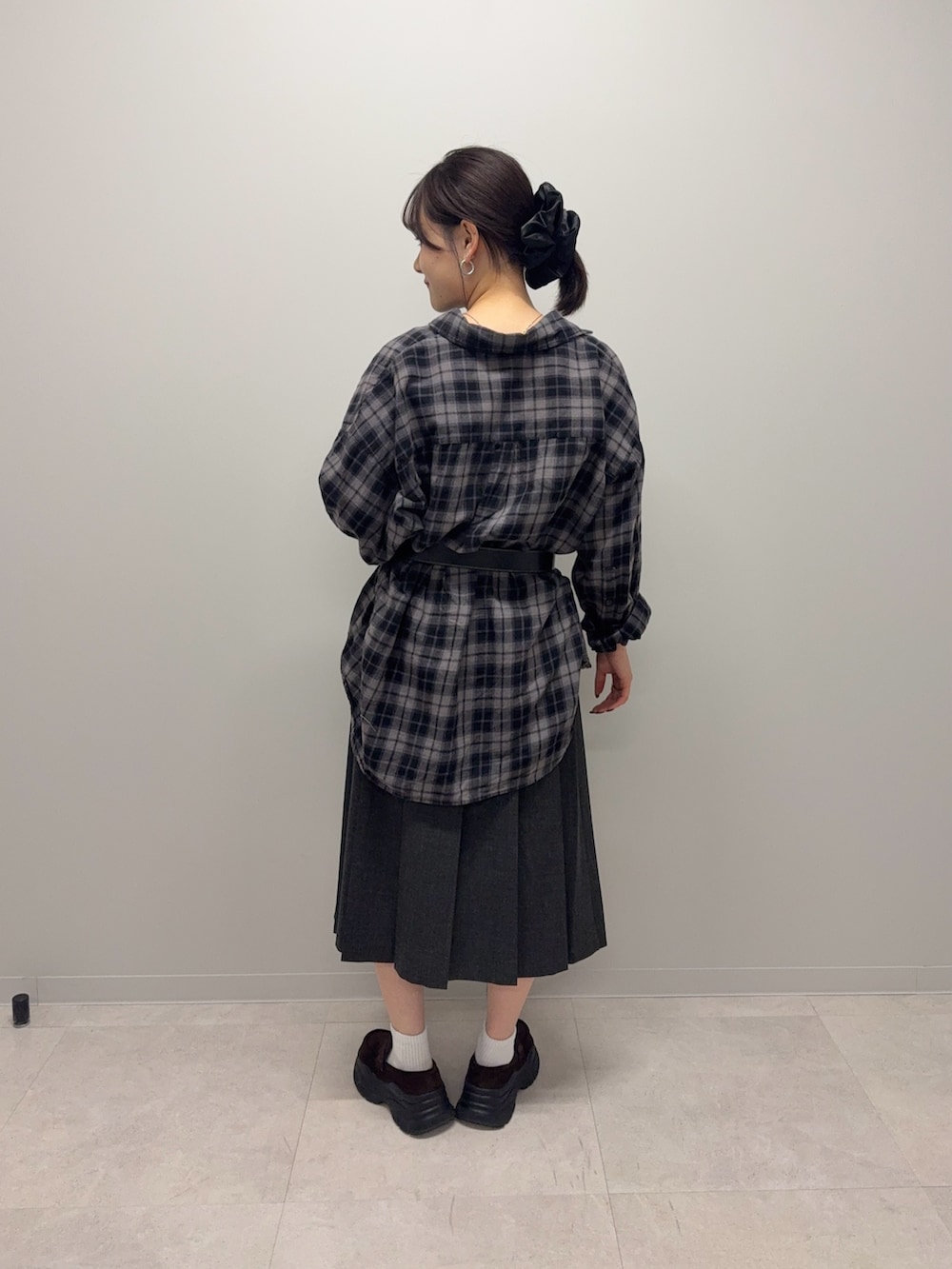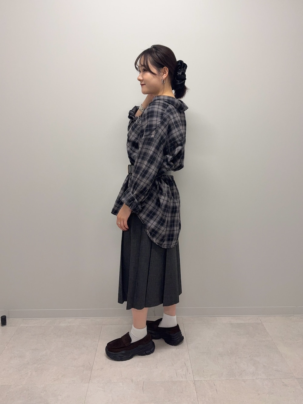 チェックシャツはオーバーサイズで丈もしっかりあります!今回はミディ丈のスカートで合わすのでベルトを巻いて少しスッキリ感を意識しました!