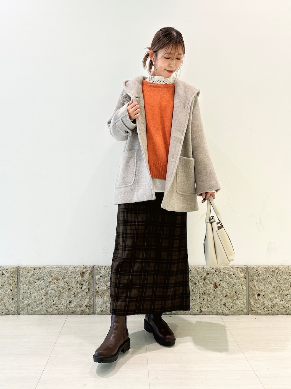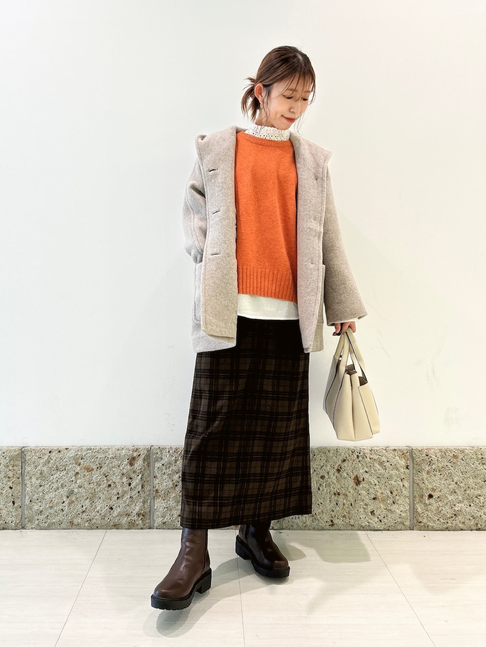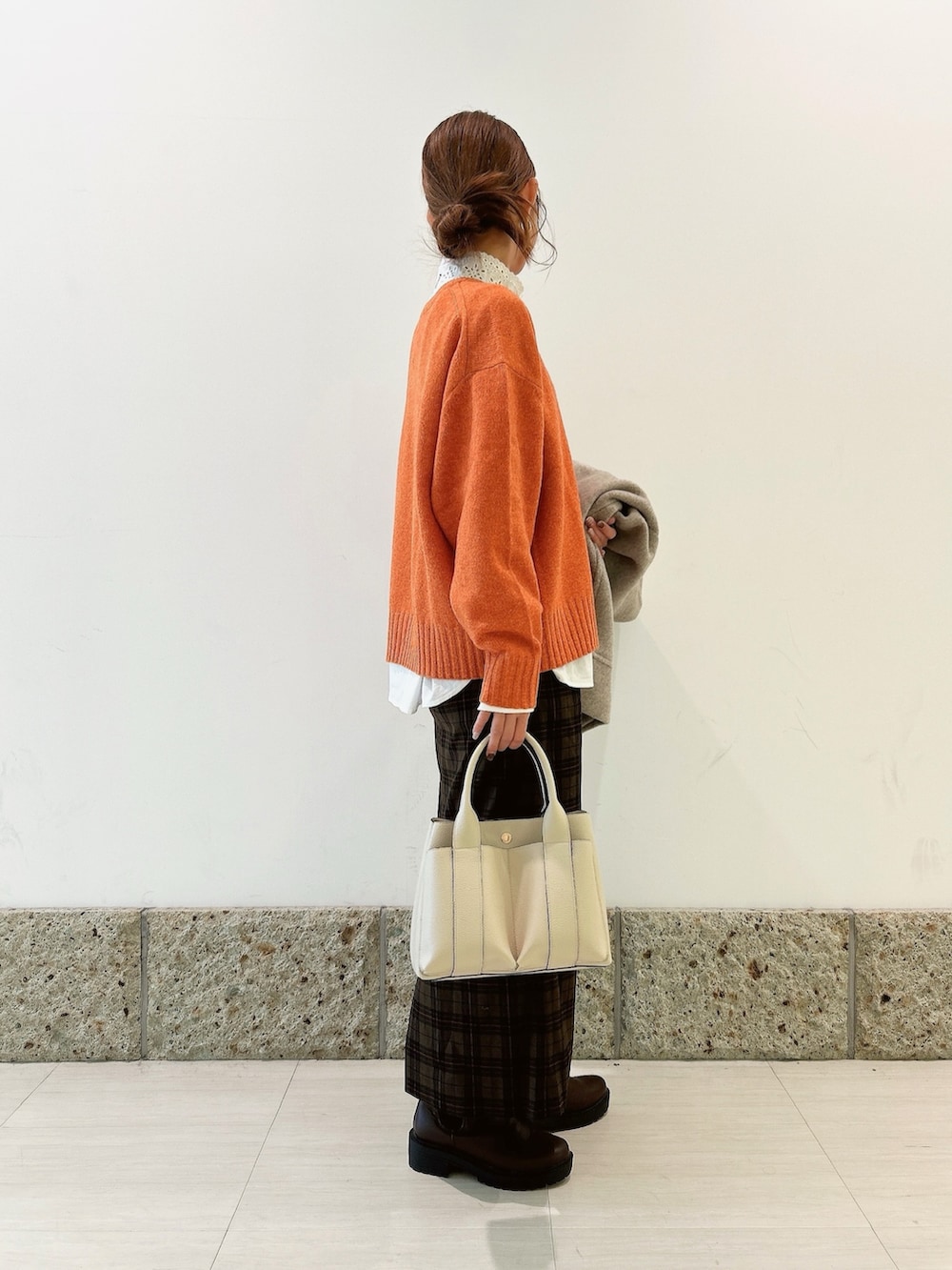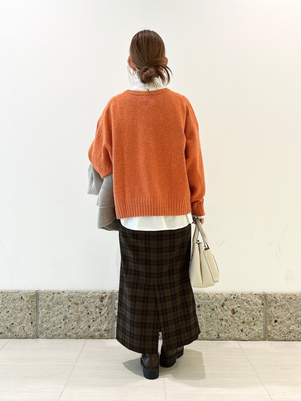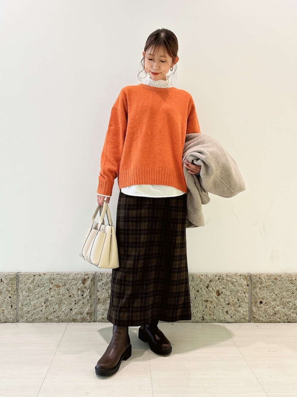 トップスには鮮やかなオレンジカラーが可愛いニットを。