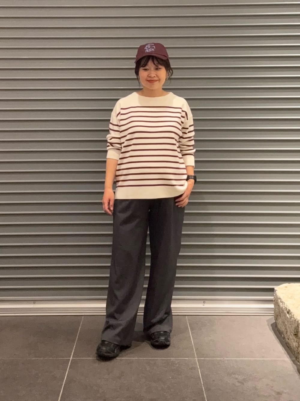 ボーダーニットはもちっと柔らかい、肌触りの良い素材で着心地抜群です。落ち感があるのでゆったりしていてもスッキリ着れます。お腹周りもゆったりしていたので、マタニティでも大丈夫でした。