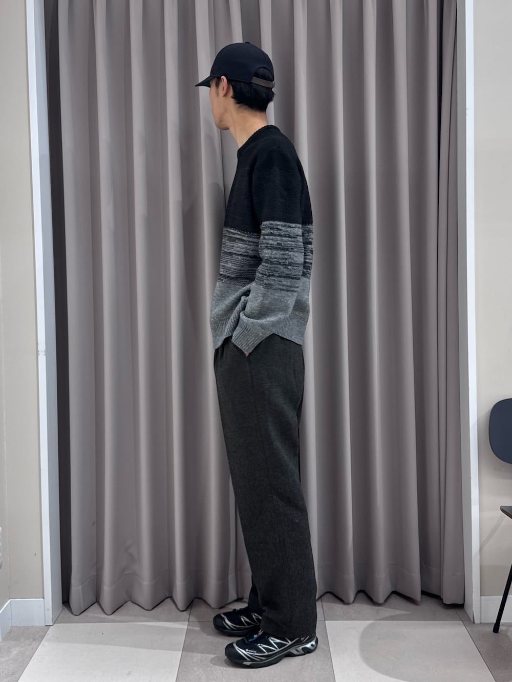 パンツは秋冬らしいウールタッチのちょいワイドのスラックス。