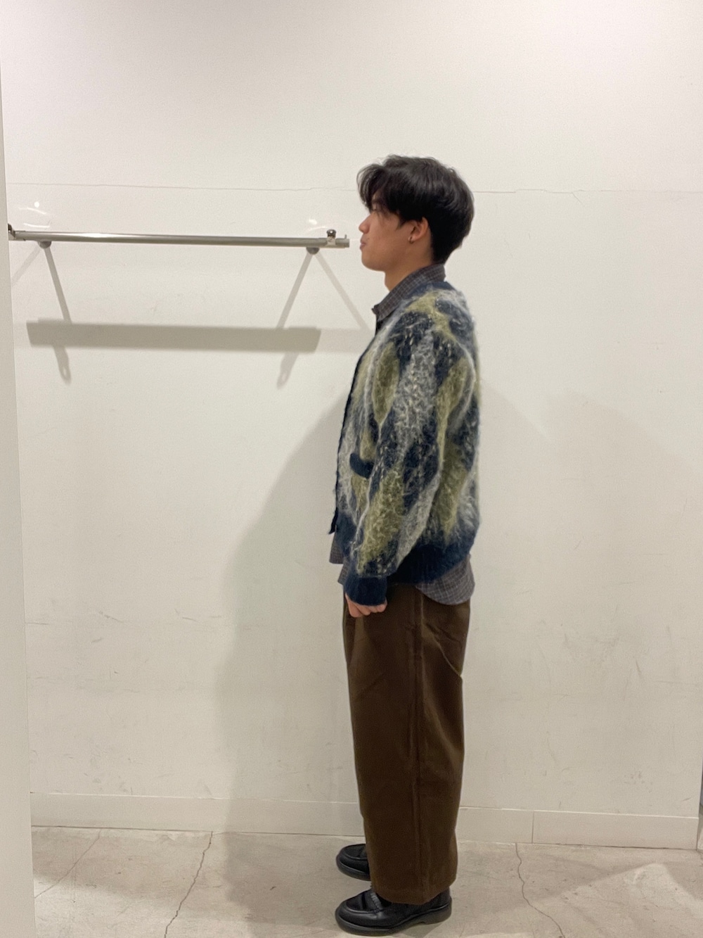 ブラウンのスラックスで温かみのある雰囲気を作り、全体を落ち着いたトーンで統一しました!!