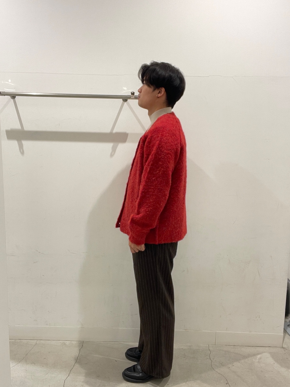 ブラウンのストライプパンツで引き締めつつ、黒のローファーで全体をきれいめにまとめました!!