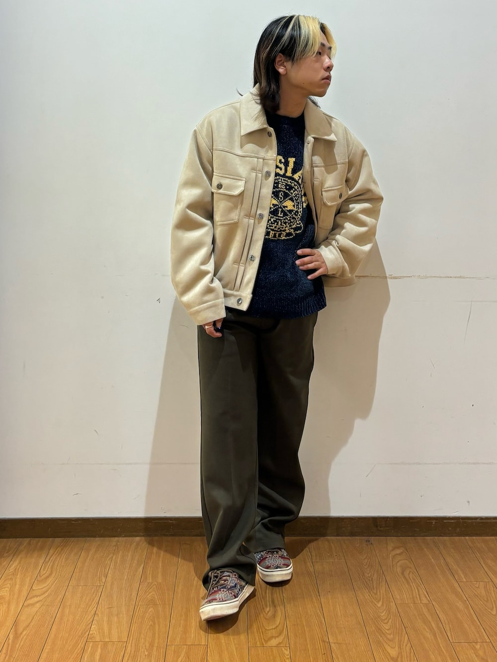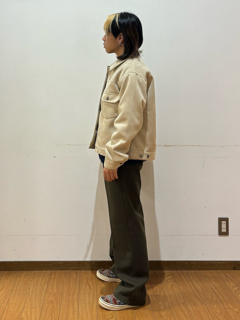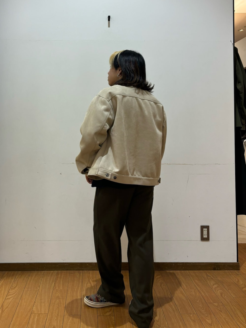 トップスのジャケットはフェイクスウェードの柔らかい質感が特徴的です。着丈が短く肩幅などにゆとりがあるところがポイントです!