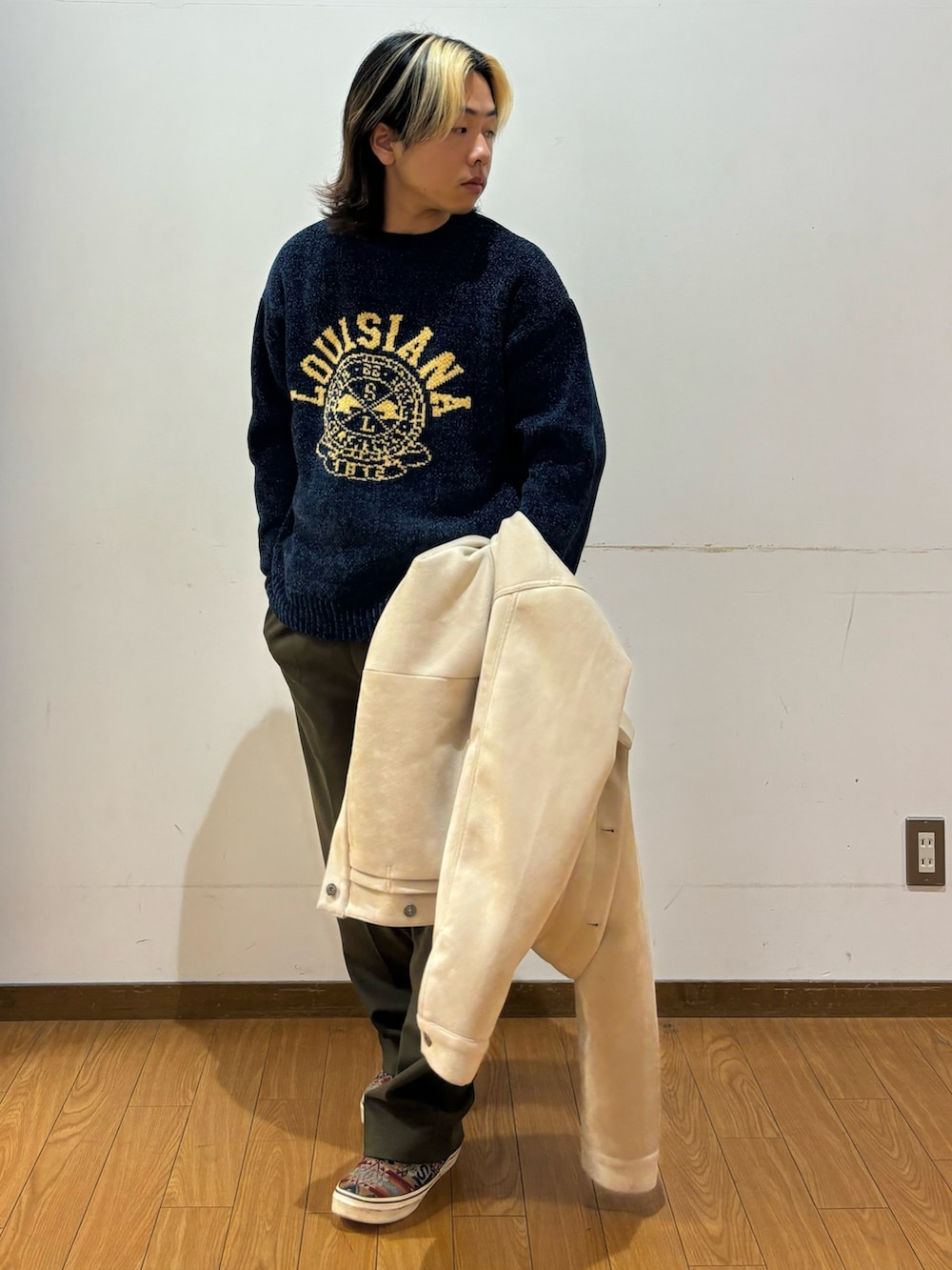 インナーのニットは紺黄のカレッジロゴがとてもかわいいです!ジャケットを羽織っても室内など一枚で着てもサマになります!
