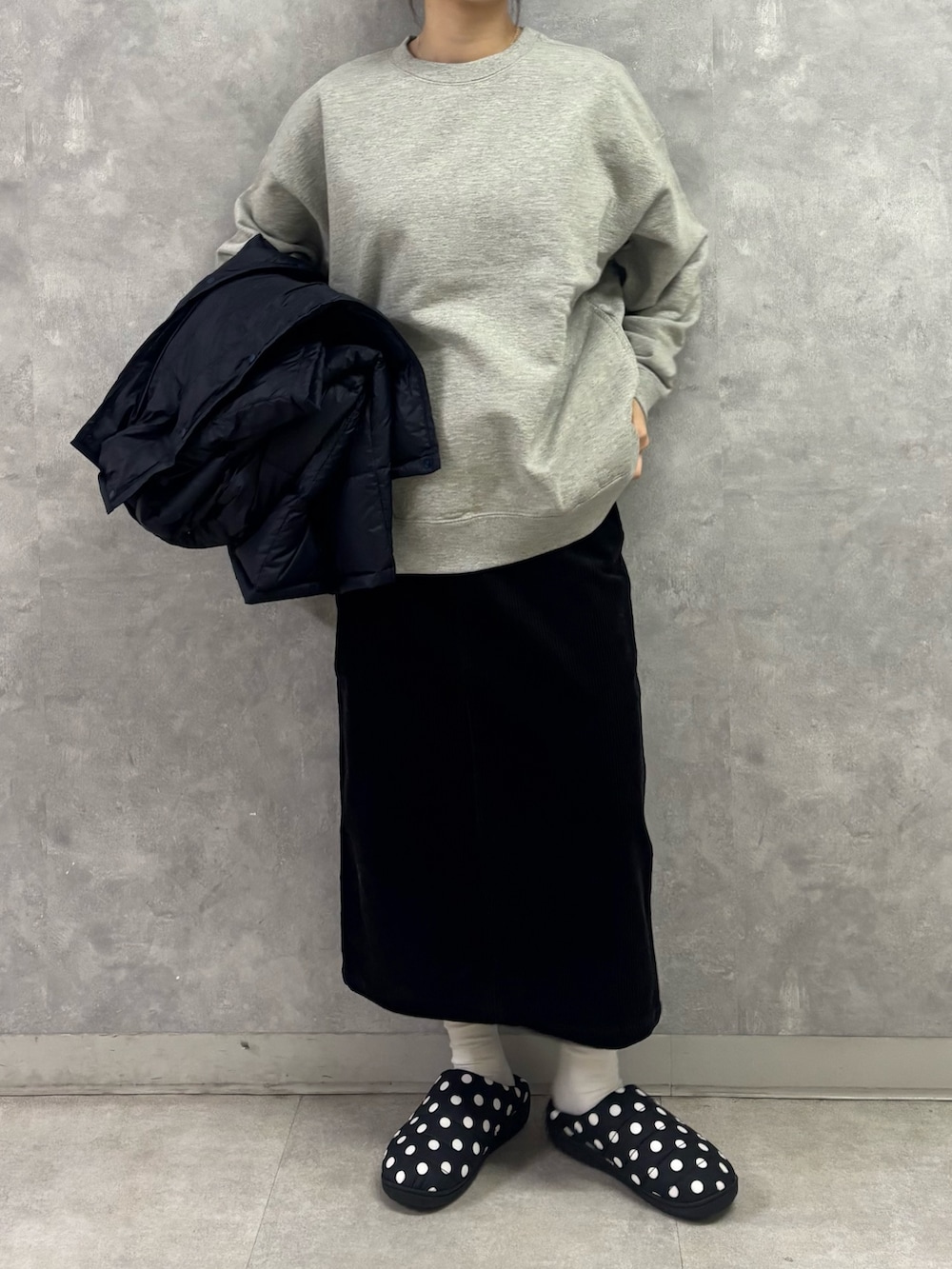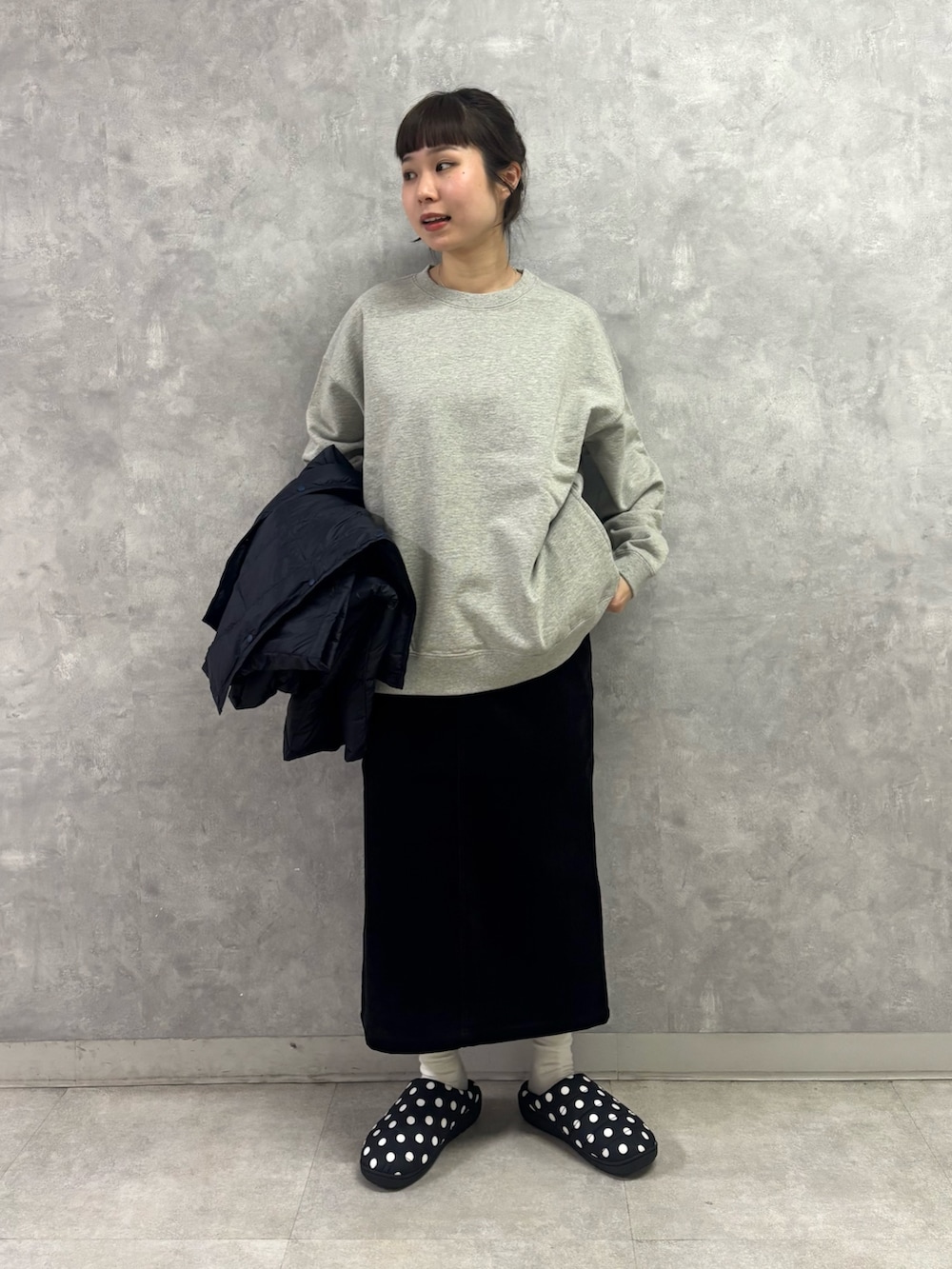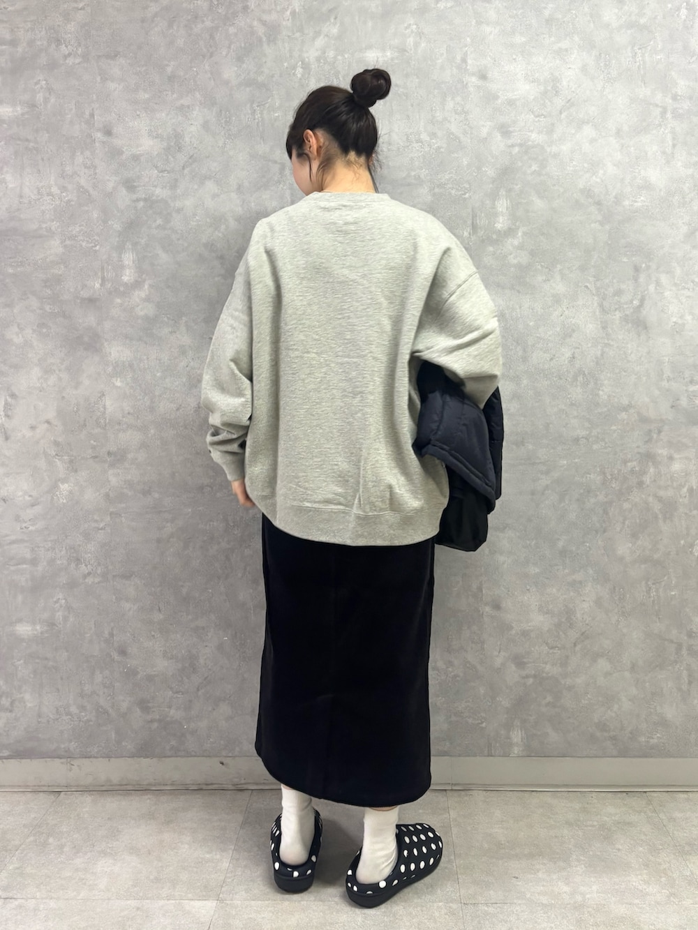 トレーナーもオーバーサイズで合わせ、スカートはスッキリとしたIラインでメリハリあるスタイリングに◎