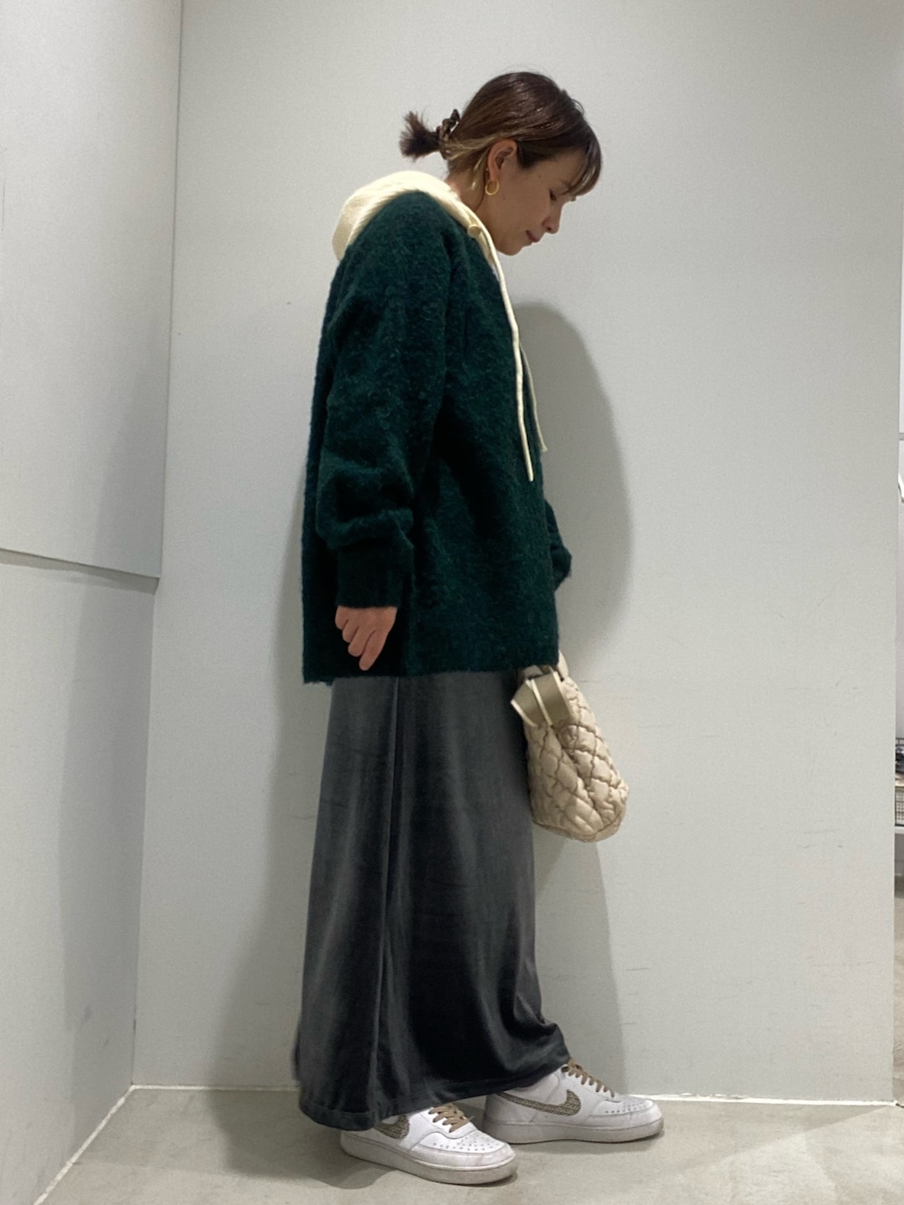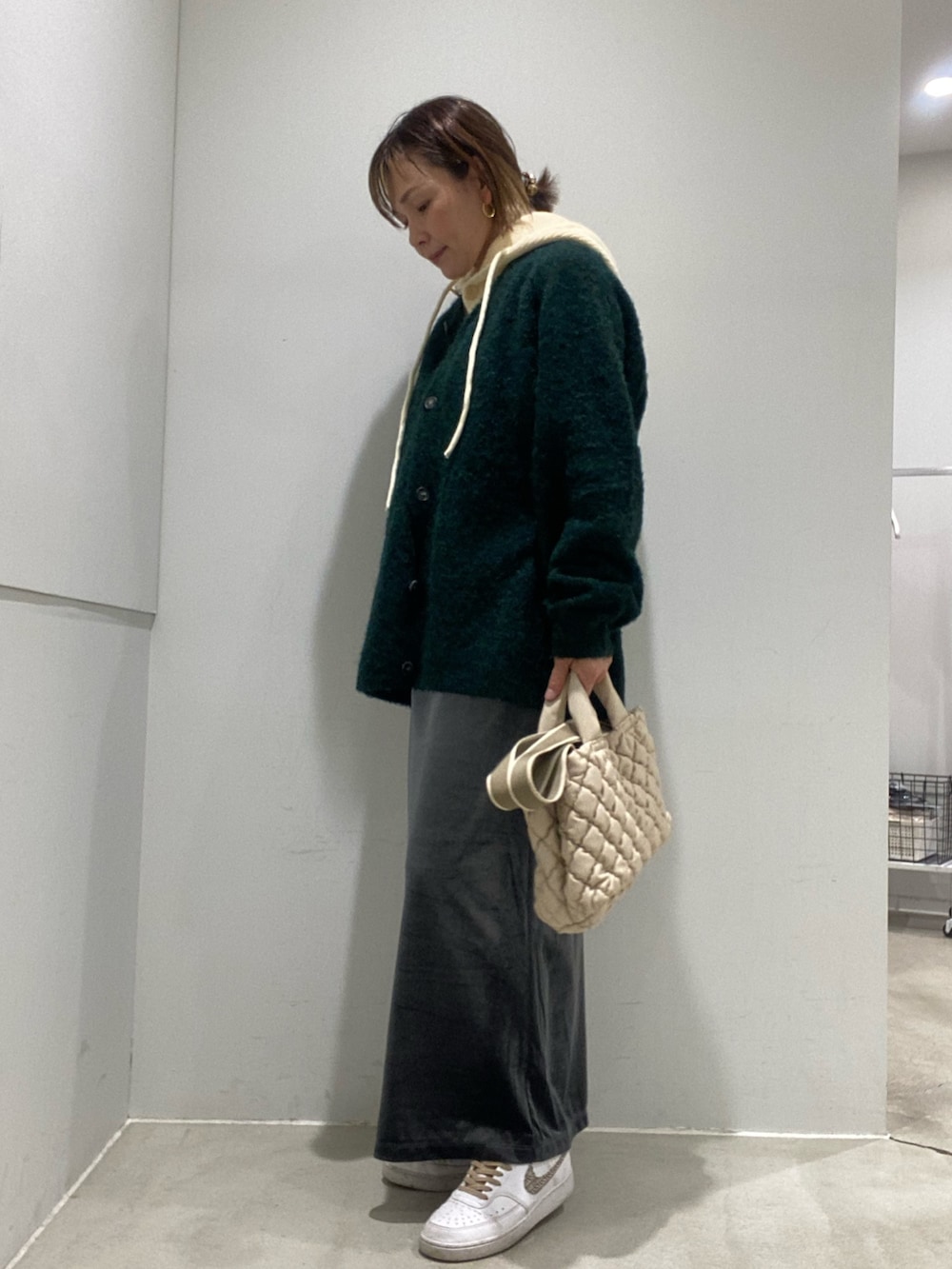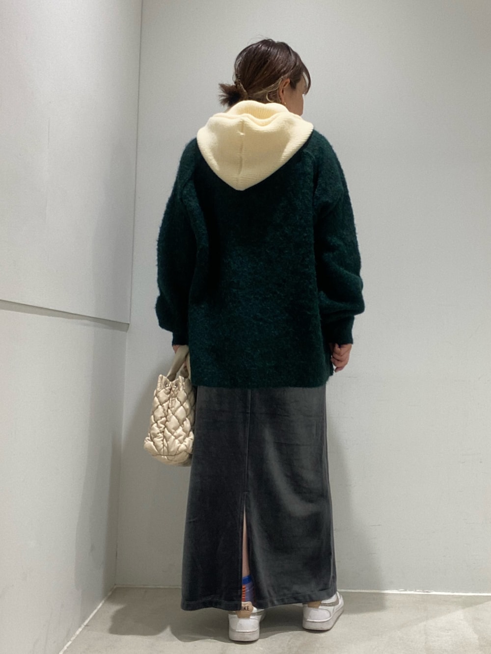 カーディガンはユニセックスで、ゆったりシルエットが可愛く、ナロースカートはベロア生地が表情があって良いです!
