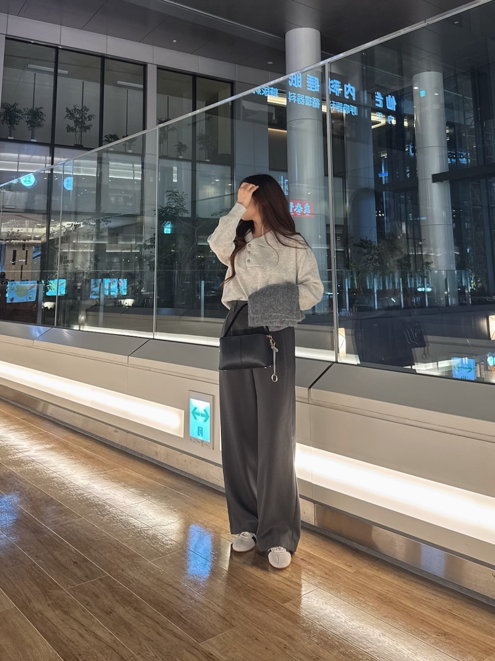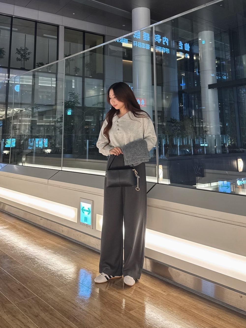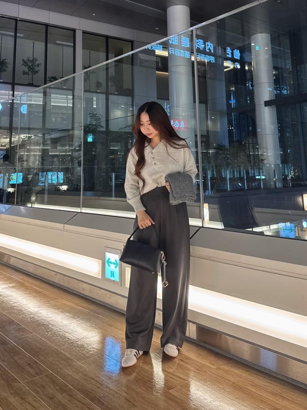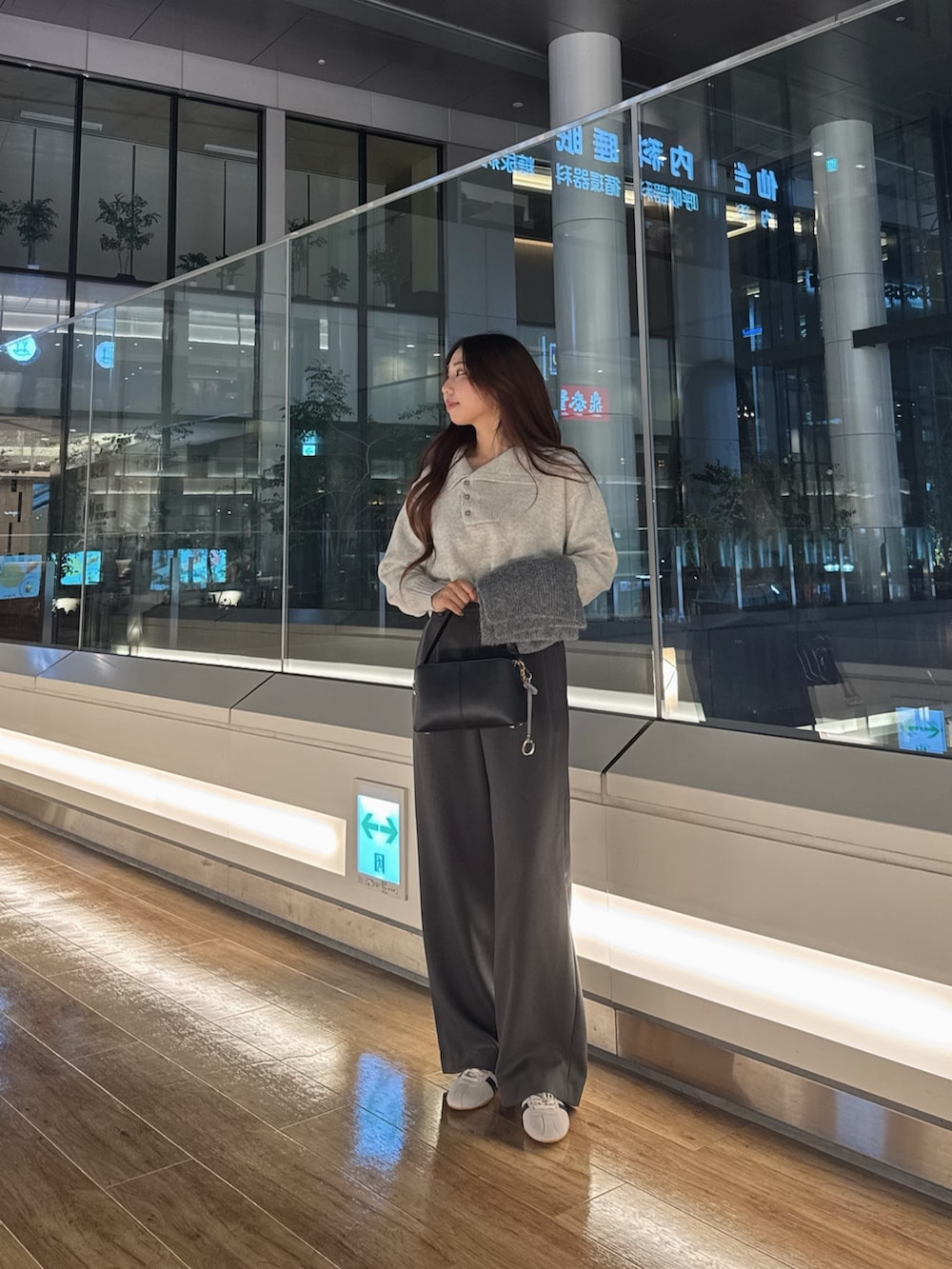 ボトムスには、万能【『UR TECH SMOOTHLUXE』ワイドトラウザー】を合わせました!トラウザーなのに動きやすく、履き心地もいい、かつ着るだけで美シルエットを演出してくれる一点は持っておきたい優れものアイテムです✨