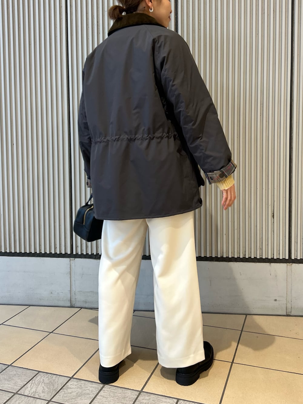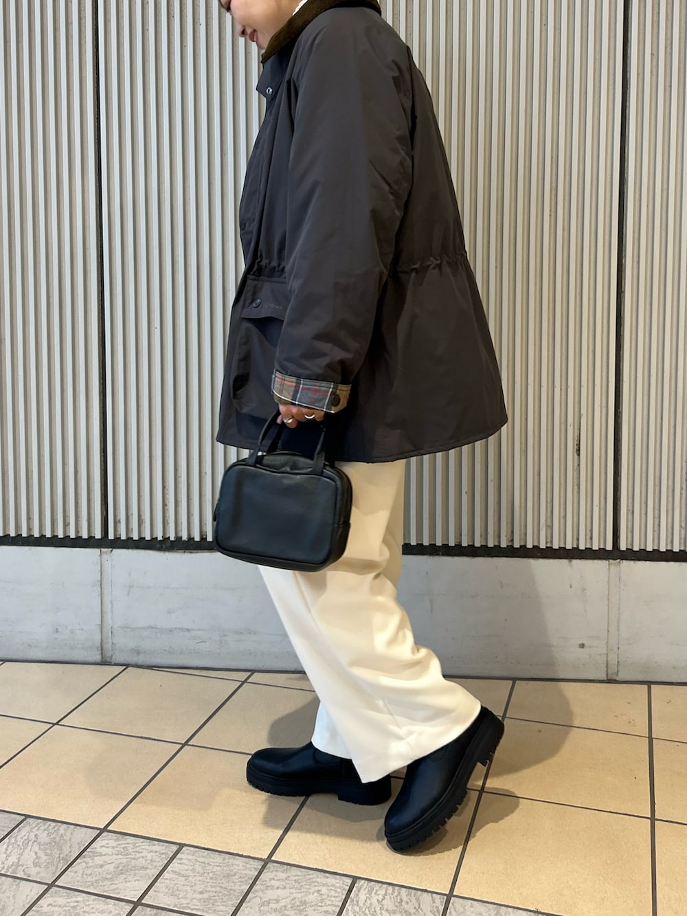 また、アウターはバブアーの別注で、アウターや小物にダークカラーを取り入れて甘くなりすぎないようにしたところがポイントです🌟