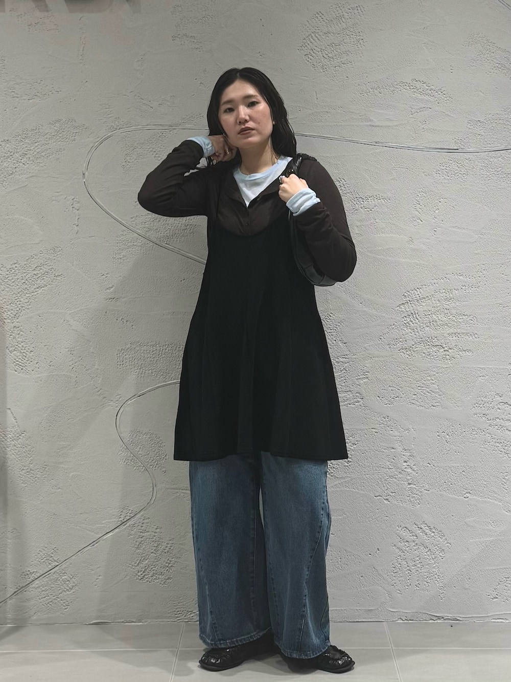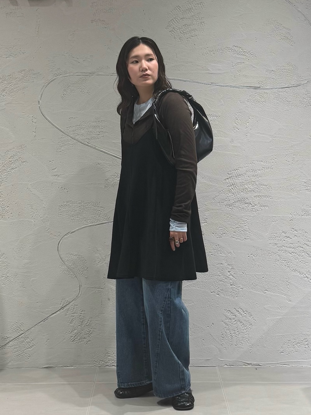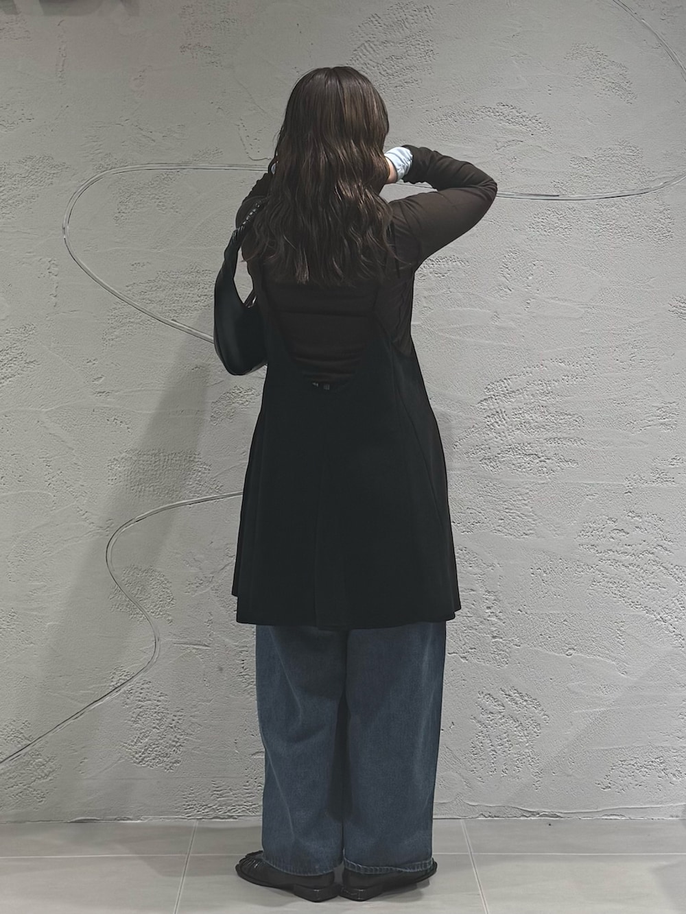 裾に向かってボリュームがありつつ、すっきりとしたVネックと後ろは深めの開きで抜け感も◎
