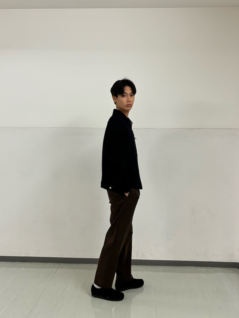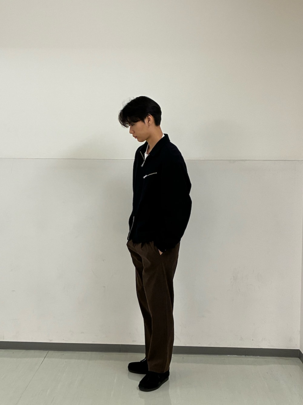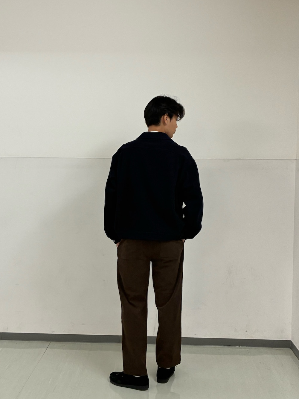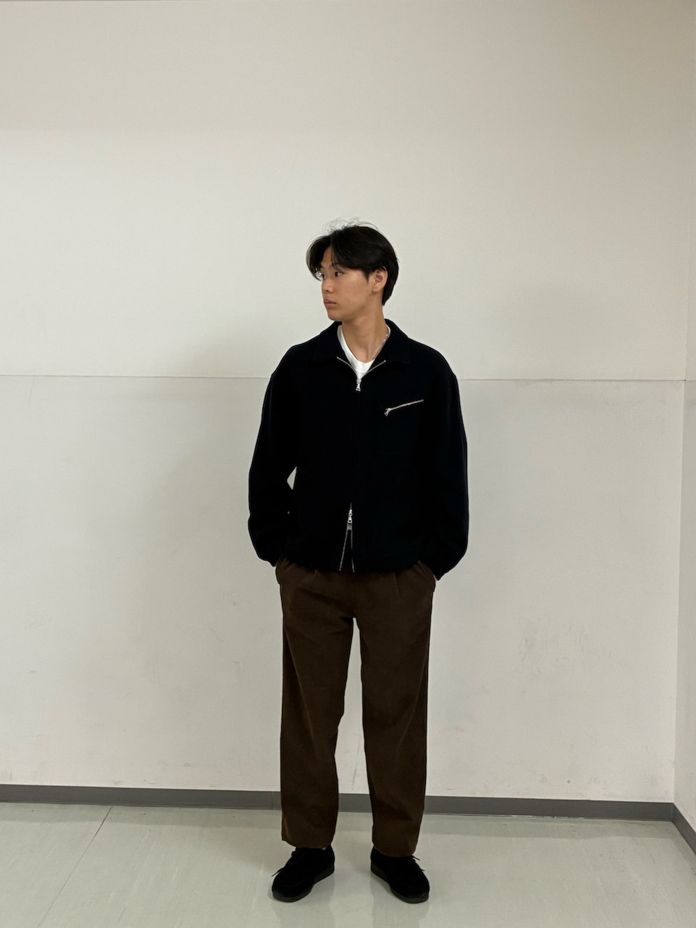 短丈ジャケットを主役にした、秋冬にぴったりのシックなコーデ。ネイビーのウールジャケットの持つ上品な光沢と落ち着いたブラウンのコーデュロイパンツの相性抜群です。