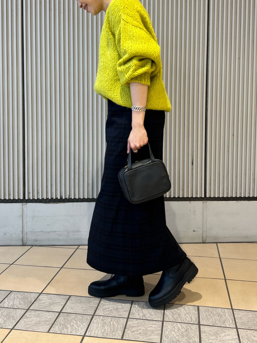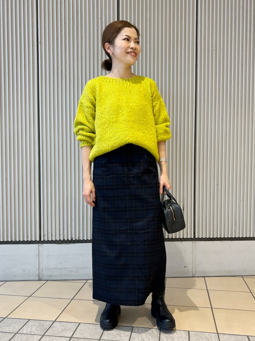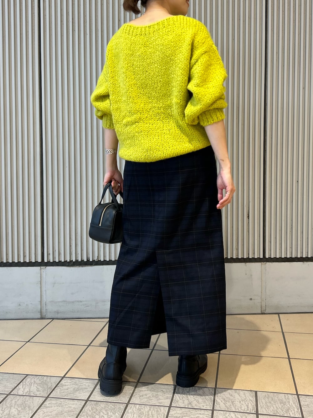 インナーに着ているTRICOTS JEAN MARCの別注ニットのご紹介です🧶フランスのニットメーカーのアイテムで、発色の良いカラーはもちろん、袖のボリューム感や首周りが美しく見えるように、シルエットにもこだわっています🌟ざっくりとした編み地やシルエットが引き立つように、ストレートのシルエットのスカートでコーディネートしたところがポイントです🙆♀️