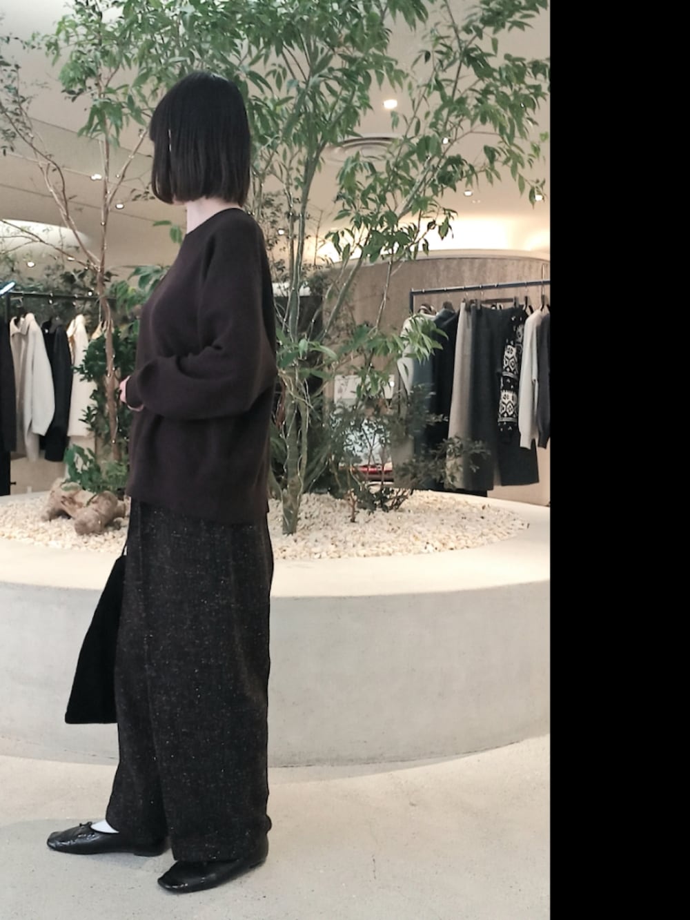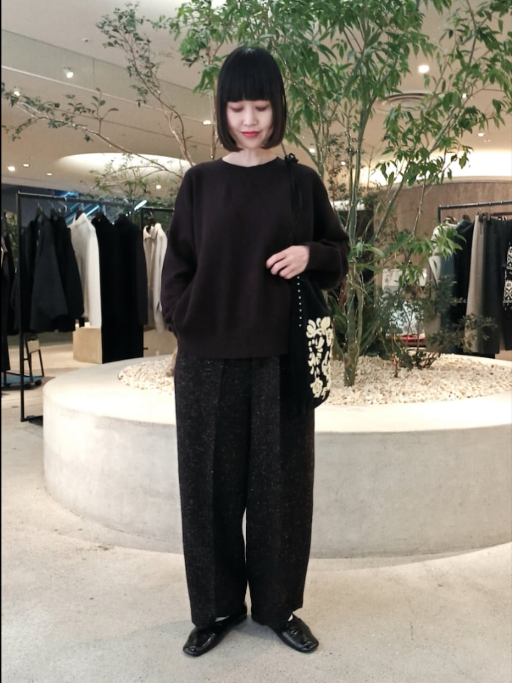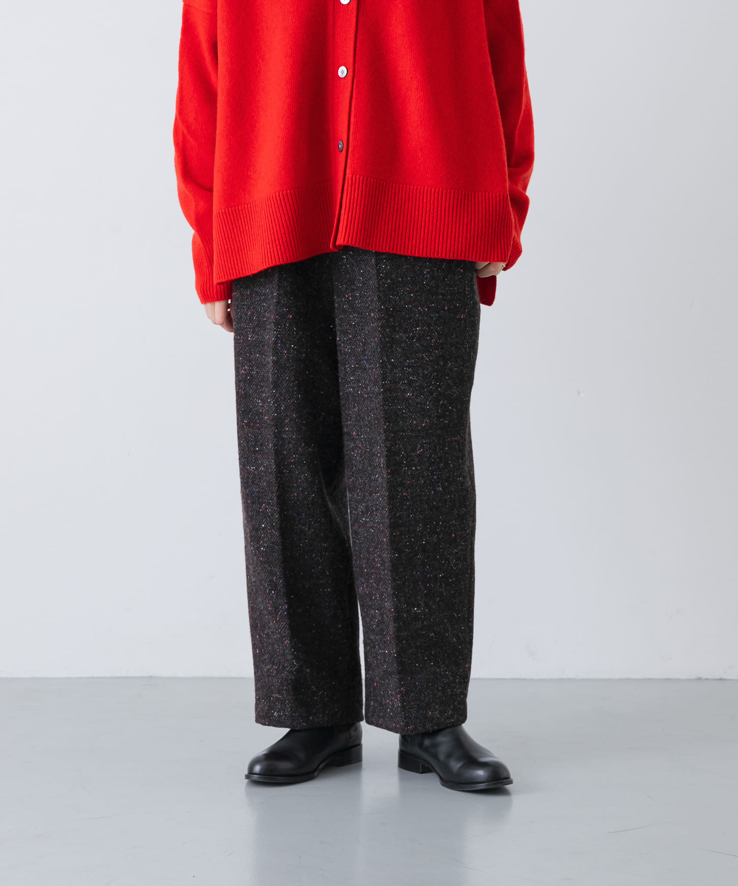 新作のパンツもカラフルなネップが可愛く、形はすっきりキレイめに着ていただけます。