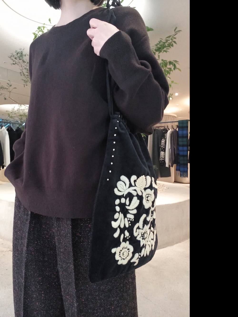 ブラウンのワントーンコーデに、手作業の刺繍が美しいバッグを合わせてみました。