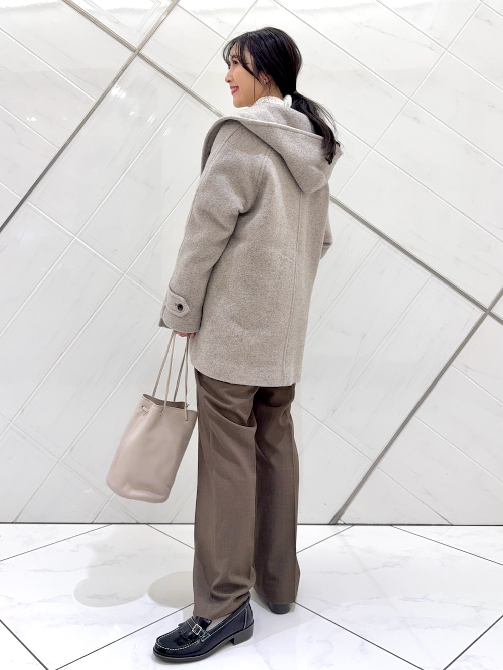 ボトムは私が企画したアイテムで、セミフレアシルエットで足が細見えします。