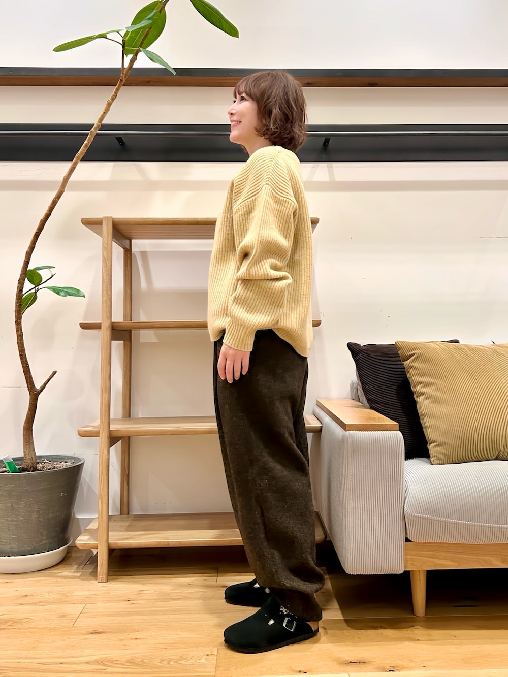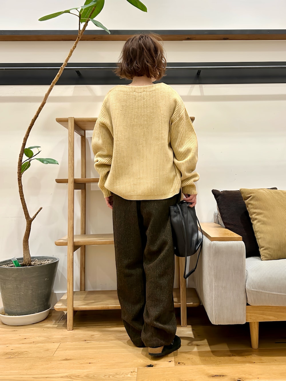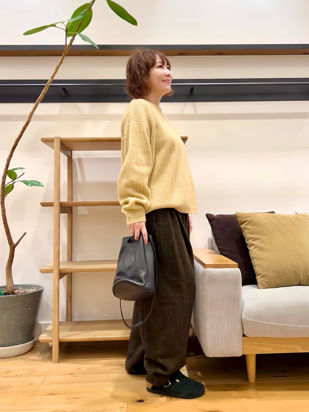落ち着いたイエローが顔まわりをやわらかく明るく見せてくれるので、ベーシックなボトムとの相性も抜群。カジュアルにもきれいめにも使える、冬のワードローブに一枚あると便利なニットです。