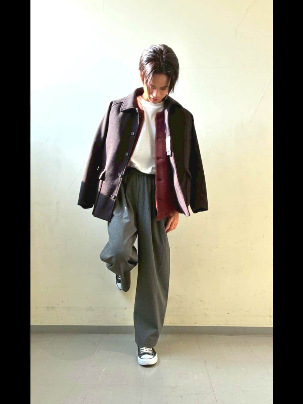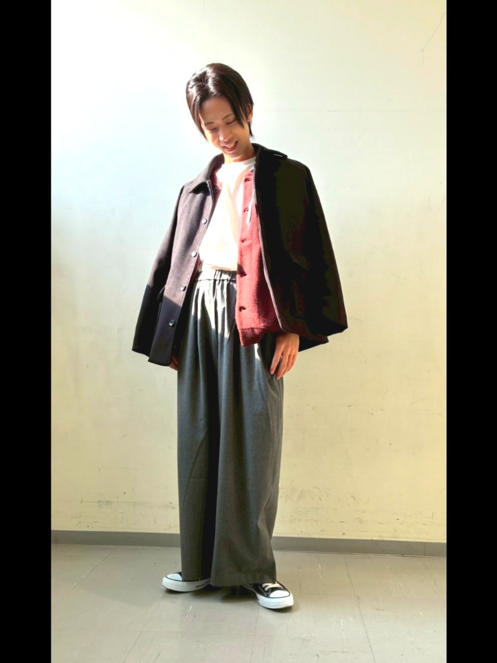 短丈コートにワインレッドのカーディガンを差し込みレイヤード、インナーとパンツは落ち着いた色味でキレイめに寄せています。寒そうですよね、そうです、オシャレは我慢😣