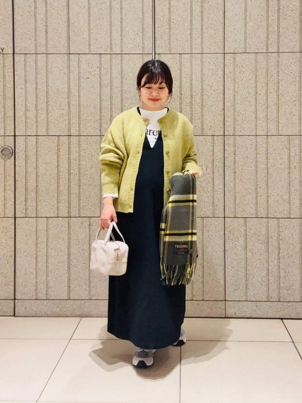 ジャンパースカートにスニーカーでカジュアルお出かけコーデにしました。TWEED MILLのチェック大判ストールをポイントに。
