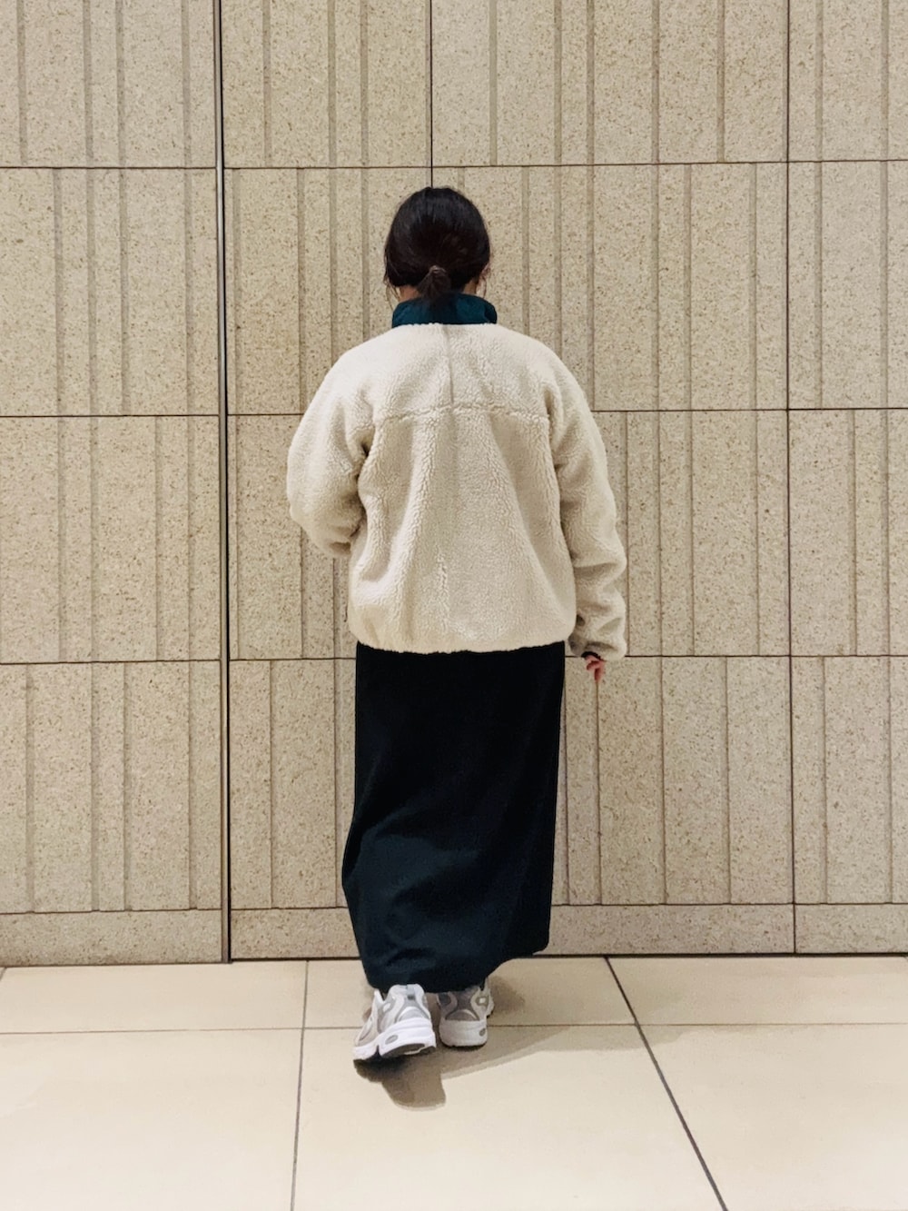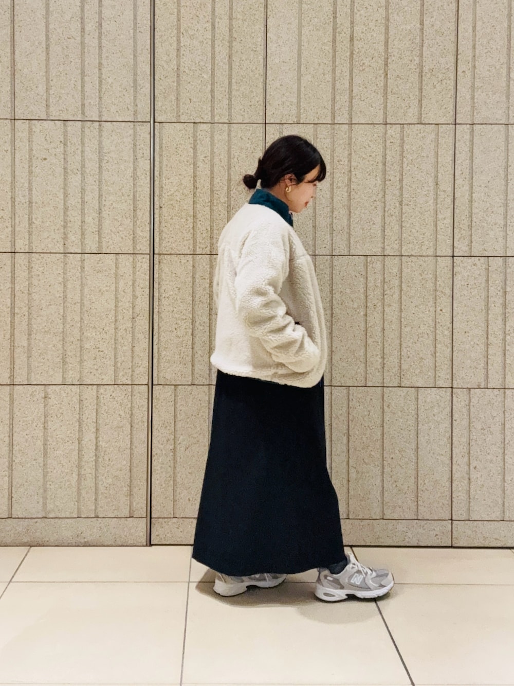 ジャンパースカートにニューバランスで休日カジュアルコーデにしました。ジャンパースカートはAラインでゆったりしてるので、マタニティでも余裕を持って着れました。