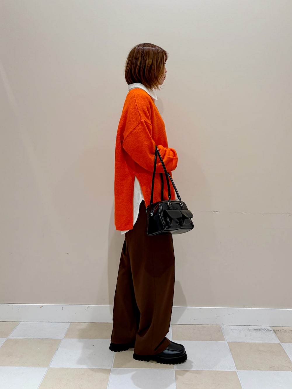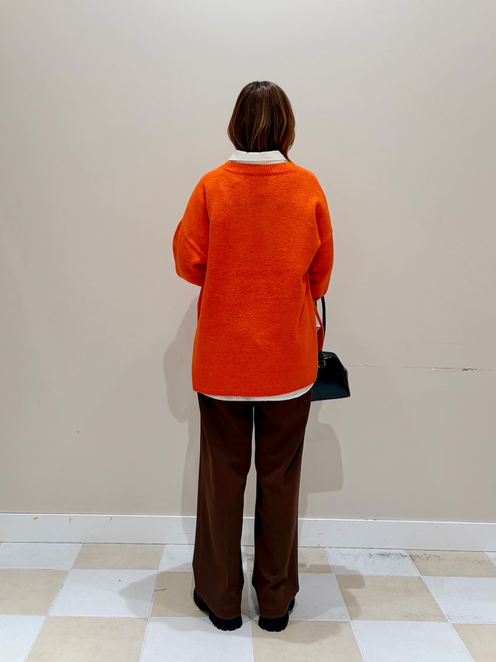 鮮やかなオレンジが可愛いゆったりシルエットのニットプルオーバーです。シャツをレイヤードしてパンツを合わせた少しマニッシュなコーディネートです。