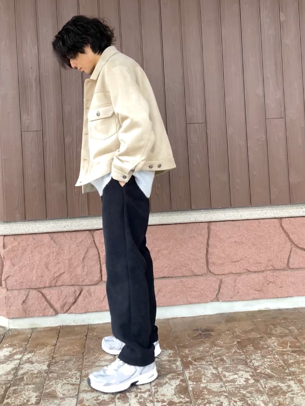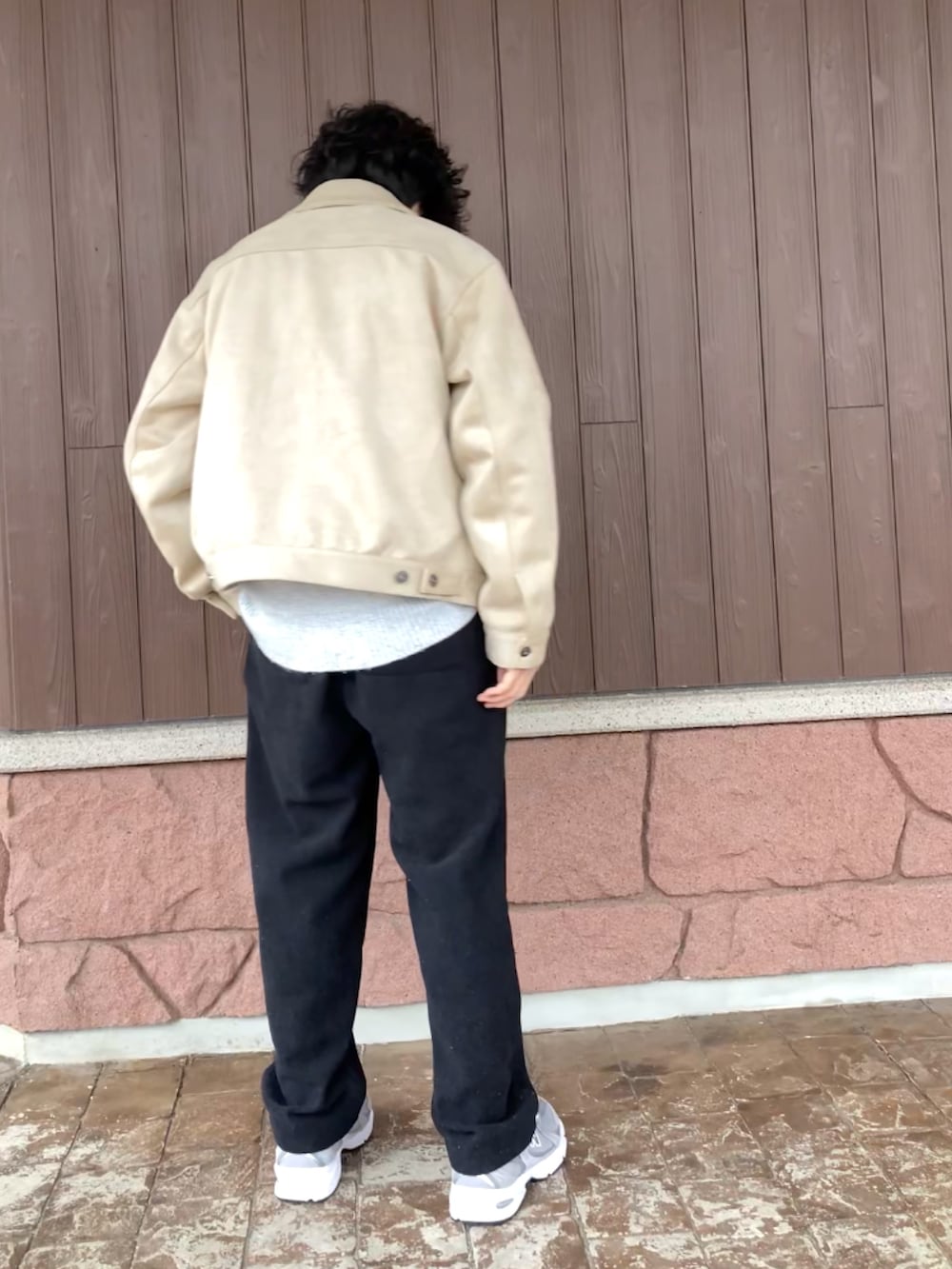 ニット、コーデュロイパンツという冬らしいアイテムにアウターでフェイクスエードのアウターのベージュでまとめてみました!触り心地がよく、生地的にも本革と違いお手入れを必要とせず劣化もしにくいので気兼ねなく使って頂けるアイテムとなってます!