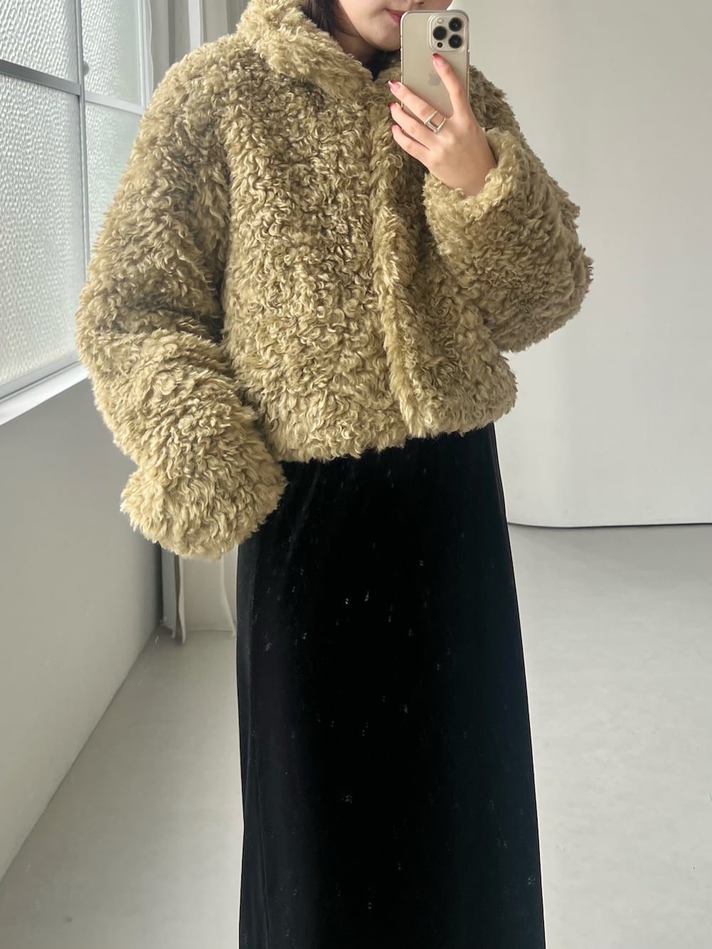 ボアジャケットとベロアスカートで大人っぽく合わせました。