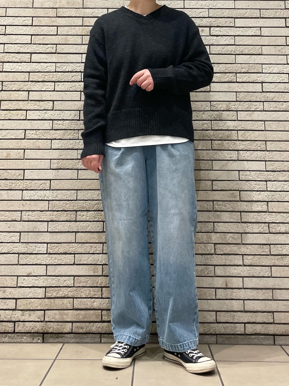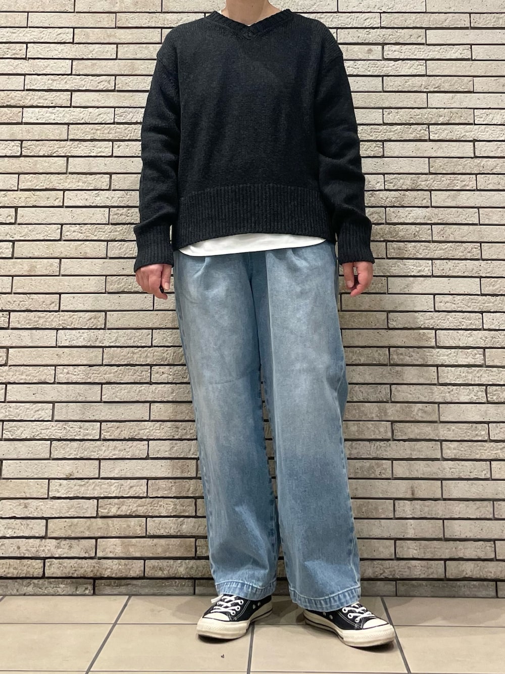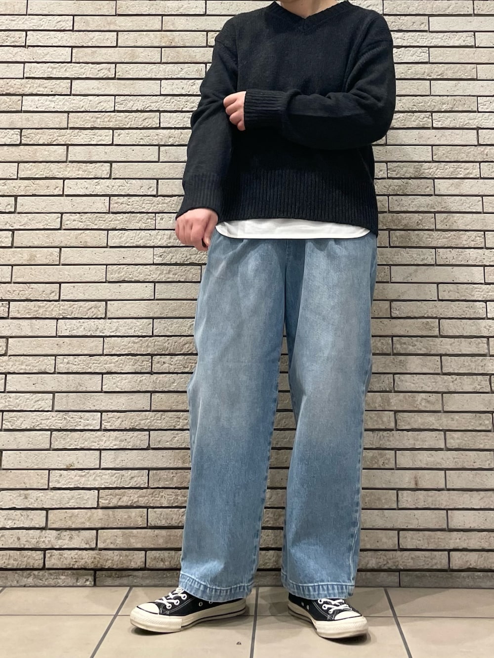 今回はデニムと合わせたカジュアルな装いに。デニムはウエストがゴム仕様で楽に着用いただけます。