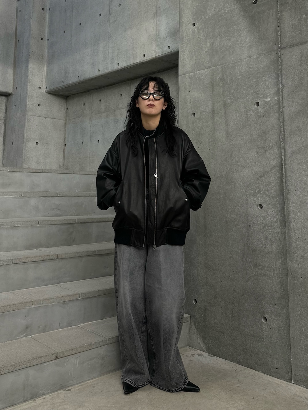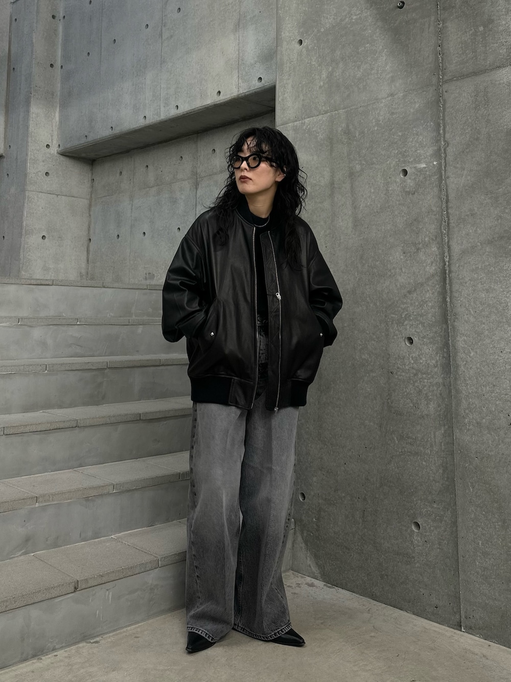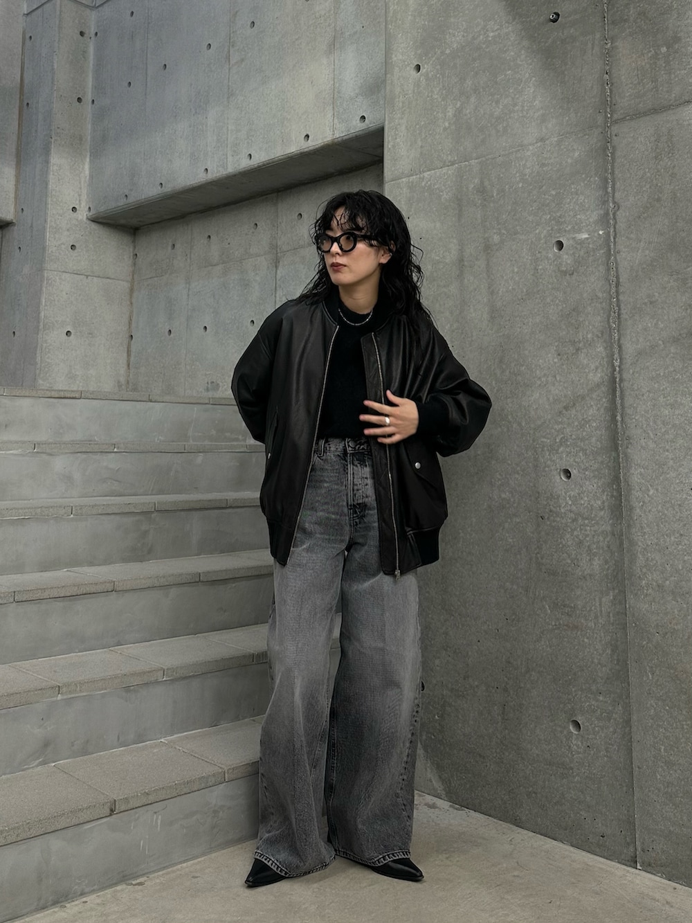 無骨なデニム×レザースタイルも、長毛のカシミヤニットを合わせることで品よく合わせることができるのでおすすめです。
