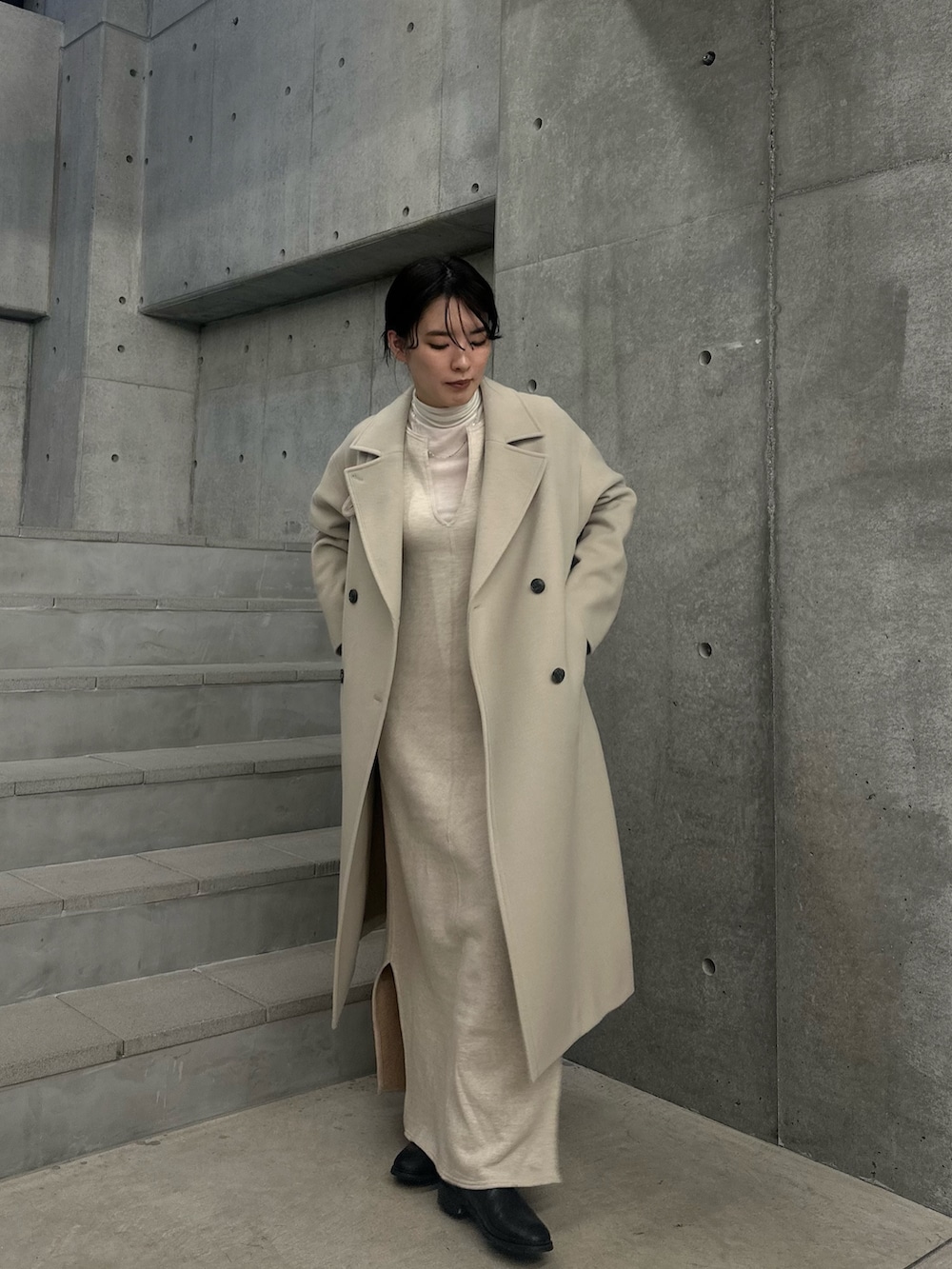私服のワンピースにコートもオールホワイトで品よく。丈はあまり長すぎない為、低身長の方にも合わせやすい丈感です。